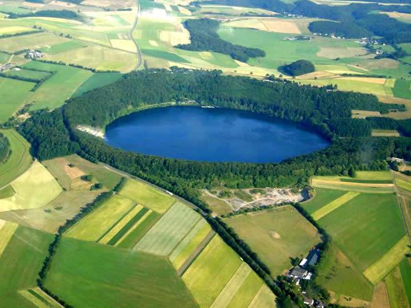 Hiernaast zie je de vulkaan, enfin je ziet het kratermeer, het Laacher Meer, dat dicht bij Koblenz ligt. Deze vulkaan zou om de 10 000 en 12 000 jaar uitbarsten. Het is nu zo'n 12 900 jaar geleden: Het kan voor ieder moment zijn, zegt de media dan (artikel).