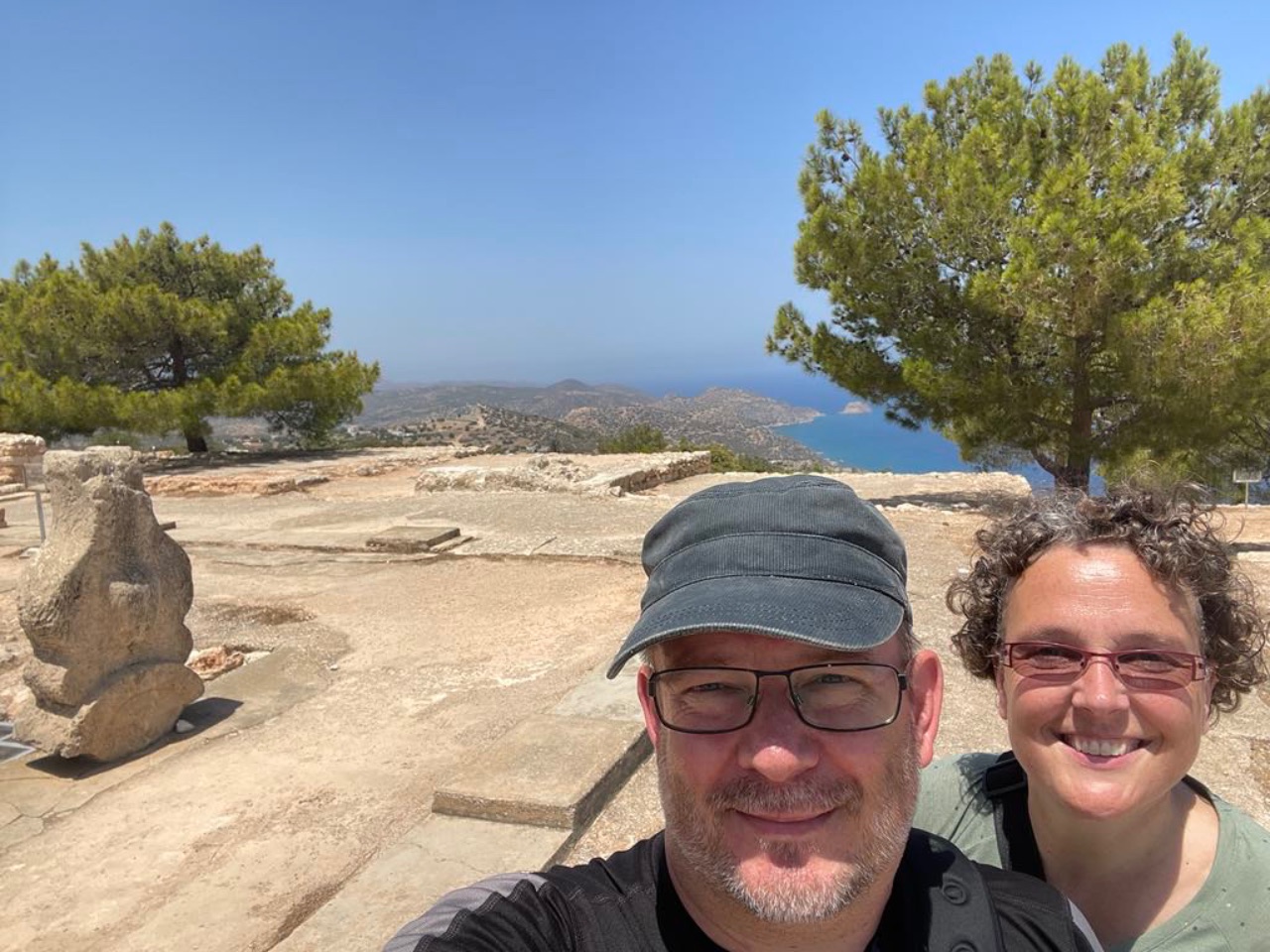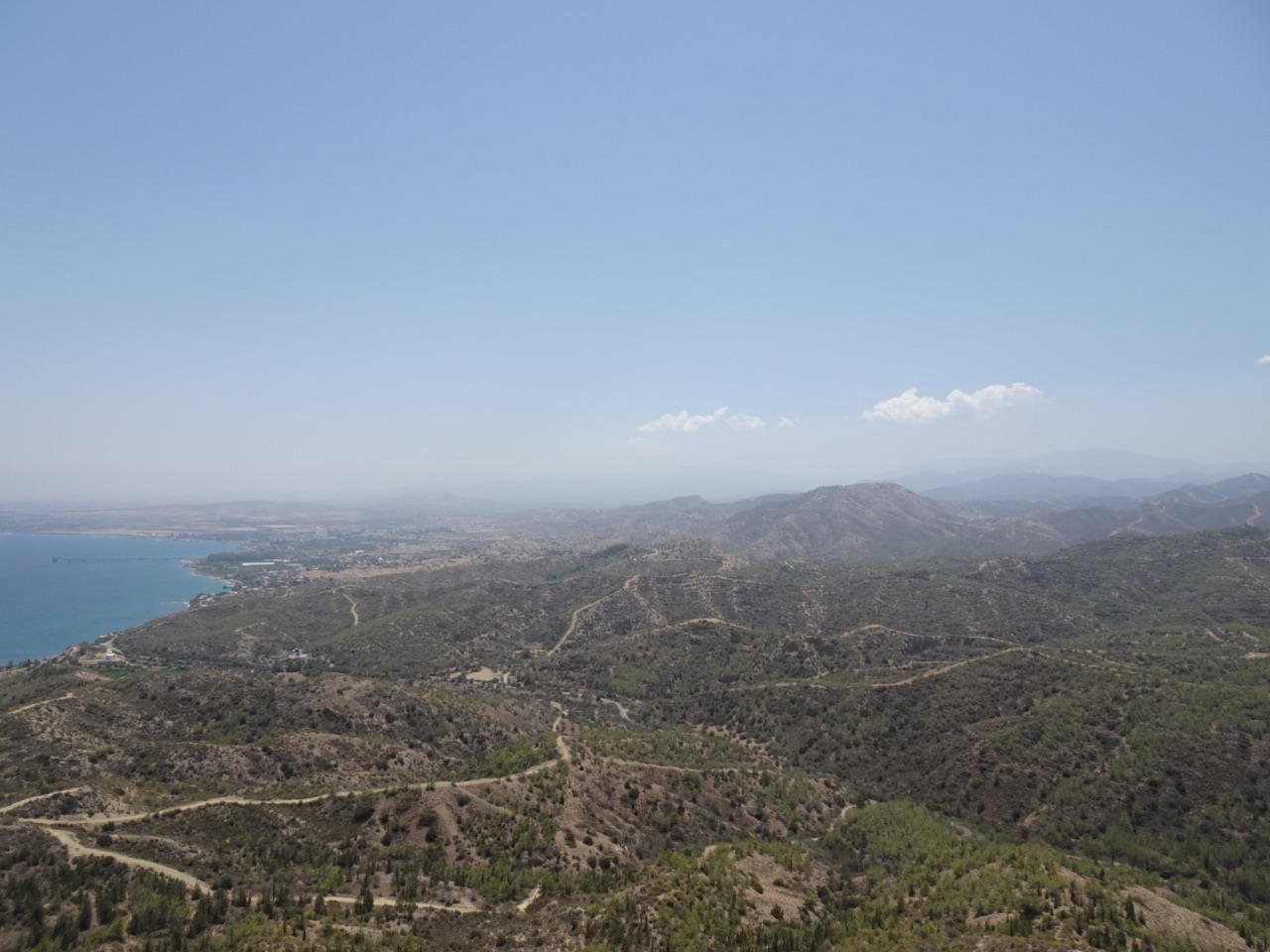 Vervolgens reden we, langs de baai van Morfou, een de uitlopers van het Troödosgebergte op. Op 250 m boven zeespiegelniveau stond een prachtig kasteel met 137 kamers en een aparte tempel, "Vuni Sarayi". Hoogstwaarschijnlijk werd het kasteel gebouwd om de inwoners van het nabijgelegen Soloi te imponeren... maar nu is er nog maar weinig van over. Daar boven op die heuvel hadden we wel een héél mooi panoramisch uitzicht! En aangezien er een zeebriesje stond en het die dag, in die regio, maar tussen 33 en 35° was, viel de temperatuur ook nog wel mee.