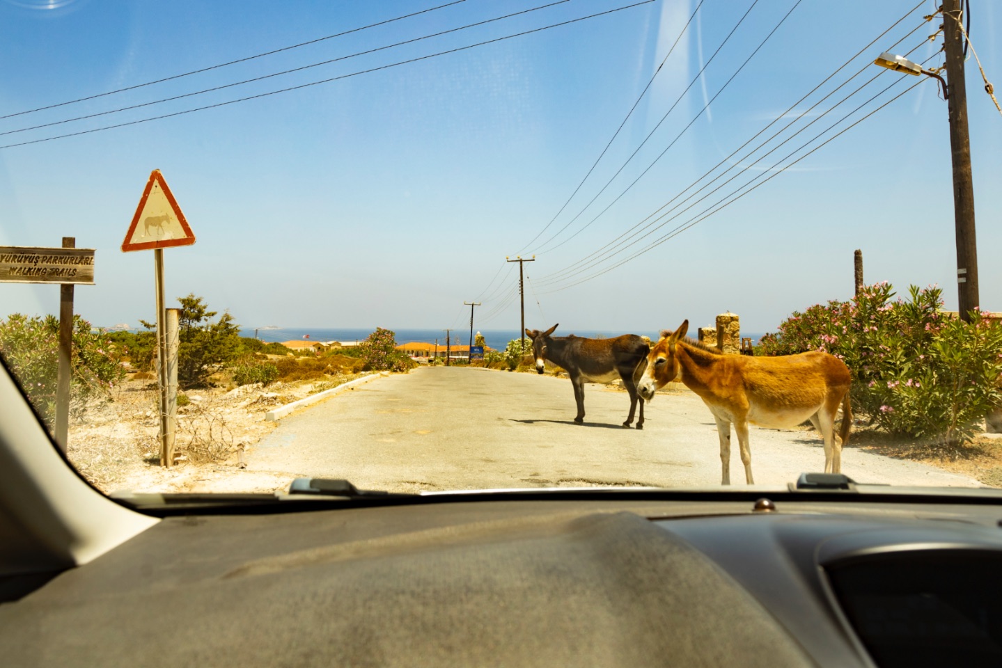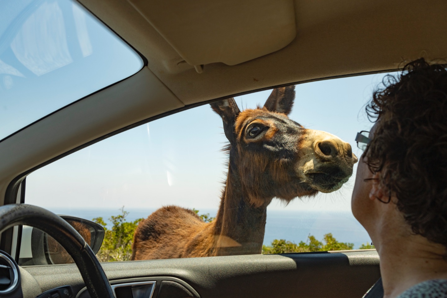 Het blijven natuurlijk wilde dieren met een eigen wil. Ze gaan niet zomaar aan de kant. Maar bovenal zijn ze ook erg slim, die ezels! We ontdekten al snel een patroon: de meeste ezels stonden minstens met z'n drieën aan de weg. Eentje stapte voor je auto zodat je moest stoppen. Vervolgens liepen andere ezels naar de bestuurders- en passagiersraampjes... om hun eten te ontvangen, hè... maar bij ons vingen ze bot! Wij voeren geen dieren. De dieren bleven natuurlijk wel met hun snuiten tegen onze autoraampjes staan en tuurden met die grote ogen van hen de auto in... Het duurde steeds even vooraleer ze, als je gas gaf, weer aan de kant gingen, maar ze wisten natuurlijk ook dat die volgende auto waarschijnlijk wél iets lekkers uit te delen had... best een leuke belevenis, die ezels... we kunnen ons voorstellen dat de mensen die in deze punt van het schiereiland werken (want er woont bijna niemand), niet zo'n geduld hebben met de koppige, opdringerige ezels... en voor het doodrijden van een ezel, moet je hoge boetes betalen... ze gaan dus sowieso je geduld testen...