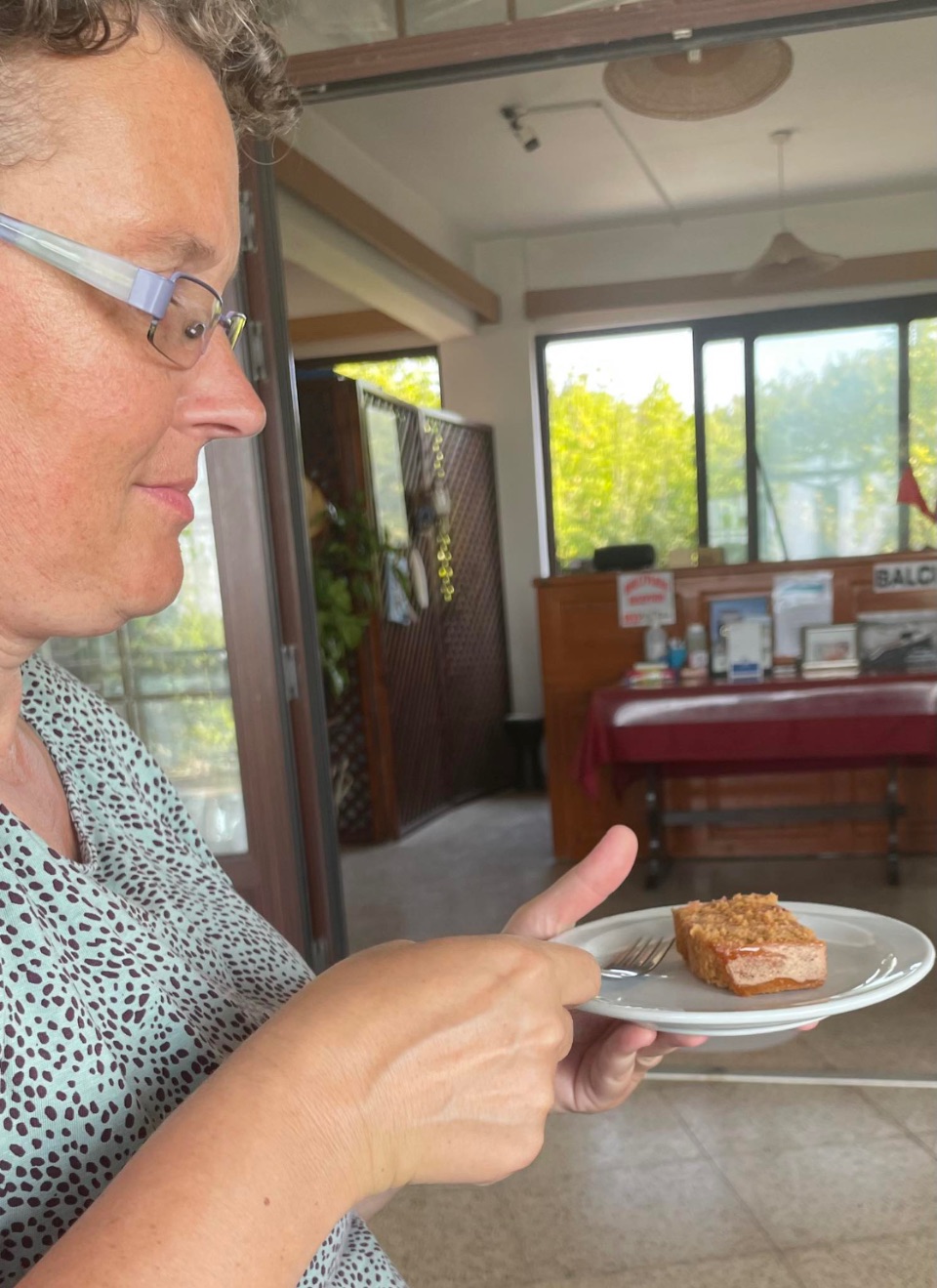 Nadat we onze boodschappen in het appartement gingen leggen, wandelden we naar het hotelgedeelte van Balci Plaza. Op dat moment was er één van vele stroompannes, eigen aan de afgelegen streek, gaande. We aten een ijsje en geraakten opnieuw met de hotelbaas aan de praat. Hij kreeg nog bezoek van zijn neef, die over de nieuwe bestelling airco's kwam onderhandelen. Toen de hotelbaas hoorde dat Ine een gebakliefhebber was, vroeg hij zijn serveerster om de cake te halen die hij nog had liggen. Het was een Russische cake, een soort kruidkoek met kersen, die de man kado had gekregen, zei hij... Onverwacht had Ine dus toch nog gebak voor haar verjaardag!