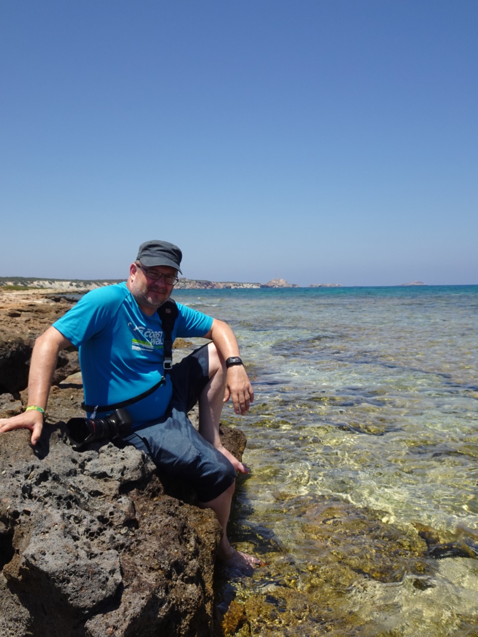zee. We hadden zwemgerief bij, maar daar hadden we geen zin in... Het water was ook niet verkoelend. Het was behoorlijk warm. Natuurlijk werd Johan zijn short ferm nat van het opspattende water tegen de rots waar hij op was gaan zitten, maar zelfs als hij geen sneldrogende korte broek aan had, droogde die al heel snel met die hitte en het best aangename zeebriesje.