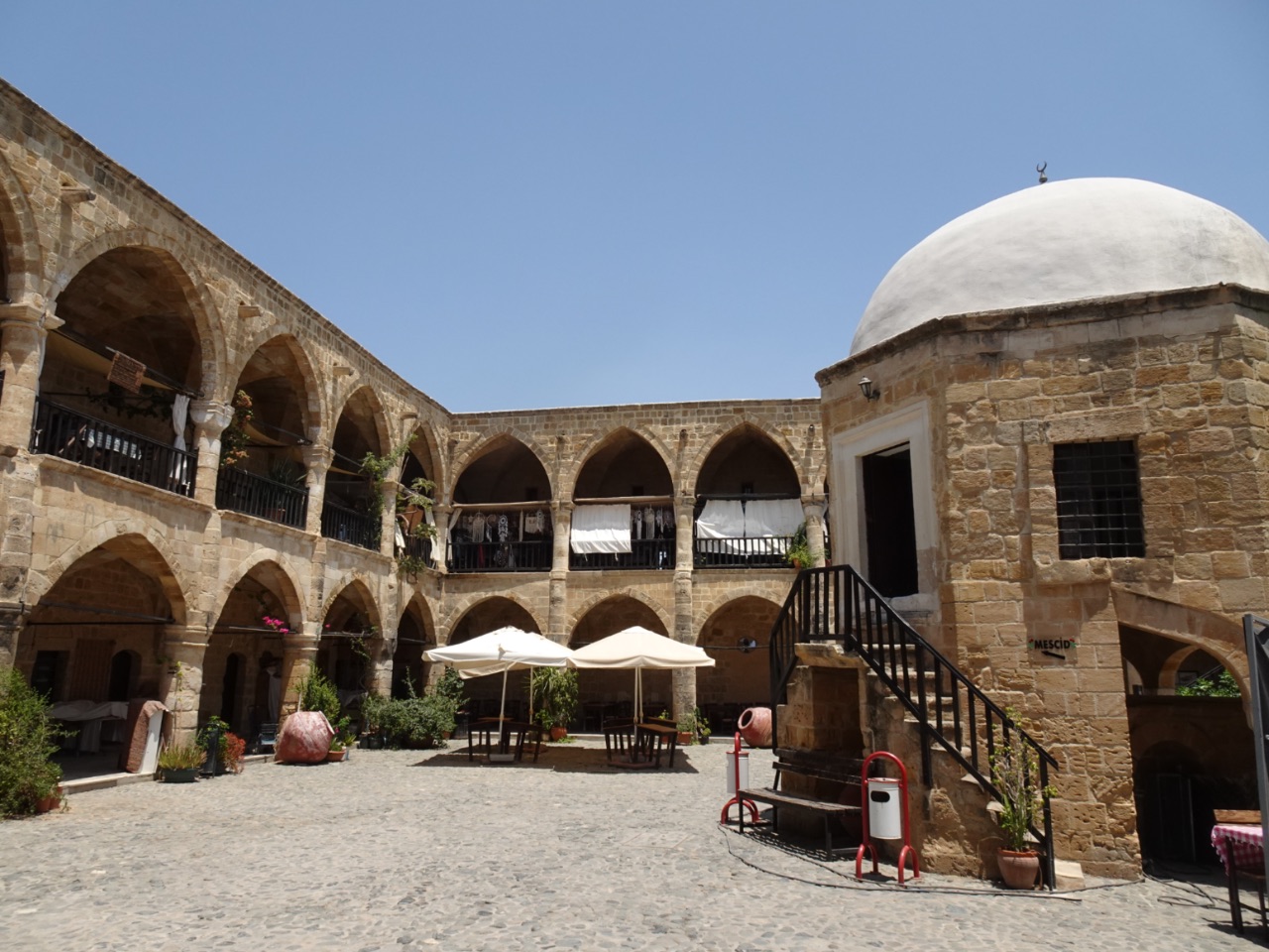 We konden het Mevlevi-museum, van de derwisjen, in de karavanserai dan wel niet bezoeken, maar bezochten wel de grootste karavanserai van Cyprus, Büyük Han. Deze is vrij toegankelijk. Deze werd in 1572 gebouwd door de Ottomanen. Midden in de binnenplaats van deze karavanserai staat een kleine/mini- moskee. Het werd een gevangenis toen Cyprus een Britse kolonie was. Daarna werd het nog gebruikt als woonruimte voor arme gezinnen en na de restauratie in de jaren 90 werd het in gebruik genomen als cultureel centrum en zijn er diverse winkeltjes en terrasjes te vinden... en een terrasje hadden we op dat moment en nóg eens nodig. We dronken en lunchten er. We kozen enkele meze, kleine gerechtjes, uit: halloumi, koupepia, gözleme en hummus... Mmmm, de Cypriotische keuken is heerlijk!