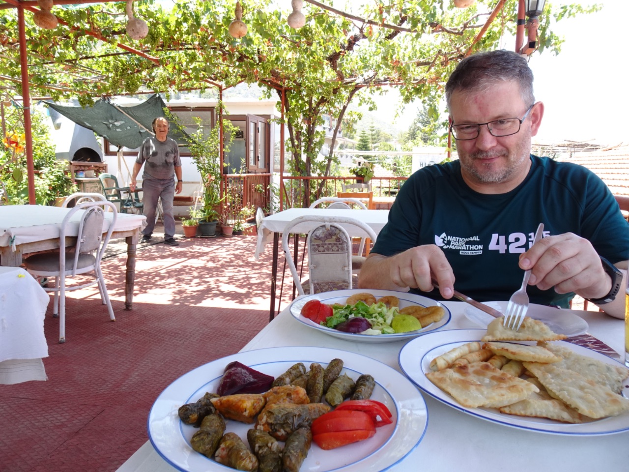 Onderweg naar de auto waren we op zoek naar een restaurantje waar ze iets anders hadden dan hamburgers en kebab... en ineens zag Johan dat er een restaurantje lag in een rijhuis zonder de gebruikelijke gevelreclame. We gingen er binnen en stapten eigenlijk een gewone woning binnen, weliswaar met verschillende tafeltjes en stoelen. We werden door de (oude) man dezes huizes tot op het dakterras geleid... en daar bestelden we enkele meze: opnieuw lekkere gözleme met halloumi-kaas, koupepia en calamares... héérlijk! We kregen er ook nog een gratis flesje water én een stukje cake bij! Wat waren we tevreden dat we toch wat doorgestapt waren, voorbij al de gewone restaurantjes die al genoeg toeristen over de vloer krijgen!