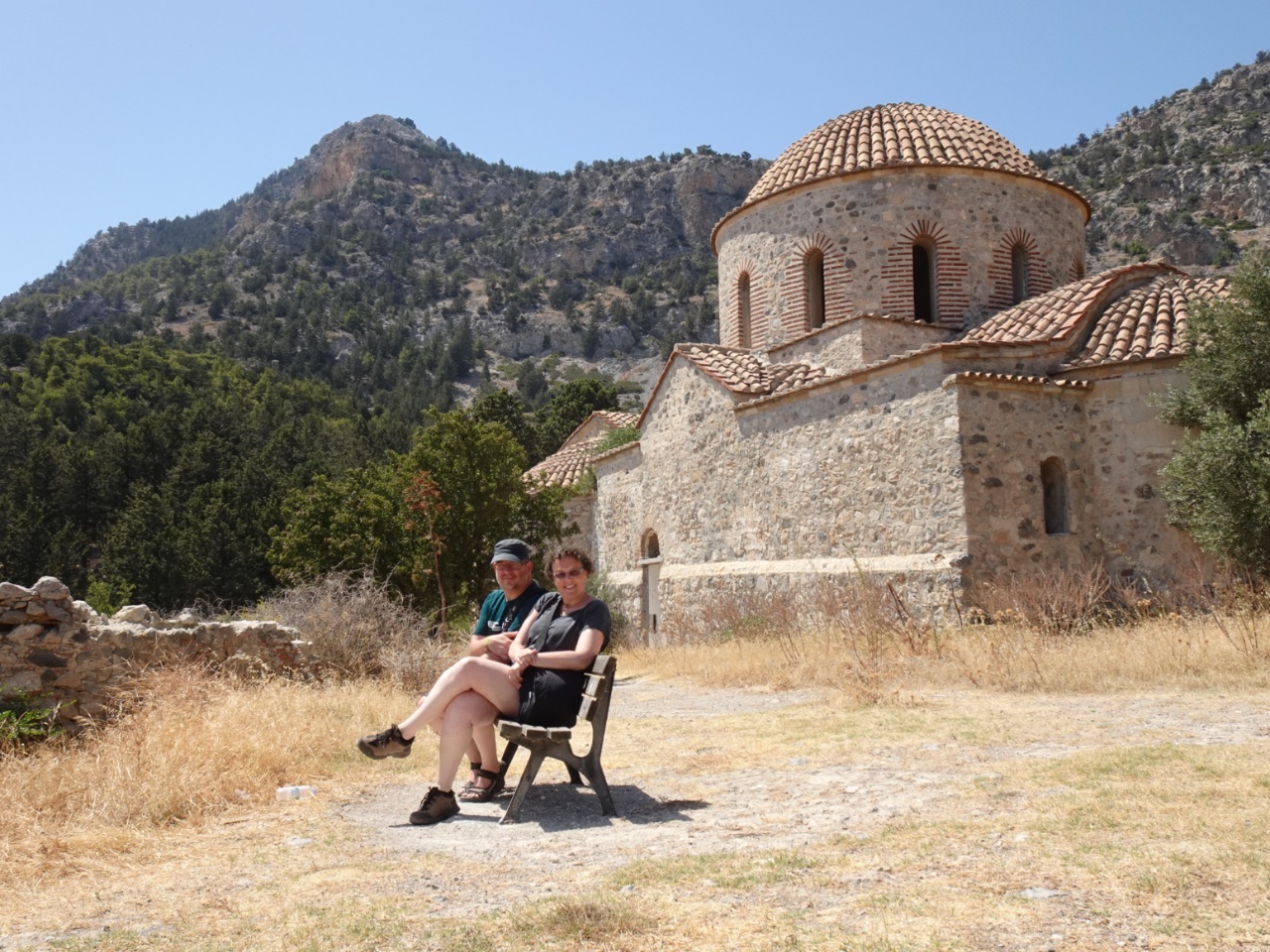 Opnieuw reden we hoger het gebergte in. We wilden er naar het hoogste kasteel van Cyprus, kasteel Buffavento, gaan. Dat ligt op 950 m boven de zeespiegel. Gelukkig was de temperatuur hogerop in de bergen wat gezakt tot zo'n 35° en het hete windje voelde minder warm aan. Toen we bij het 12e eeuwse Byzantijnse Panagia Apsinthiotissa-klooster, onderweg, kwamen, konden we niet meer verder met de auto... Blijkbaar moesten we van daaruit te voet verder... en duurde dit een half uur... en waren er 600 trappen... dat zou al zwaar zijn bij gewone temperaturen, laat staan op dat moment... helaas dus geen bezoek aan het Buffaventokasteel! We probeerden het nog te vinden op de heuvelhelling, maar vonden het niet.