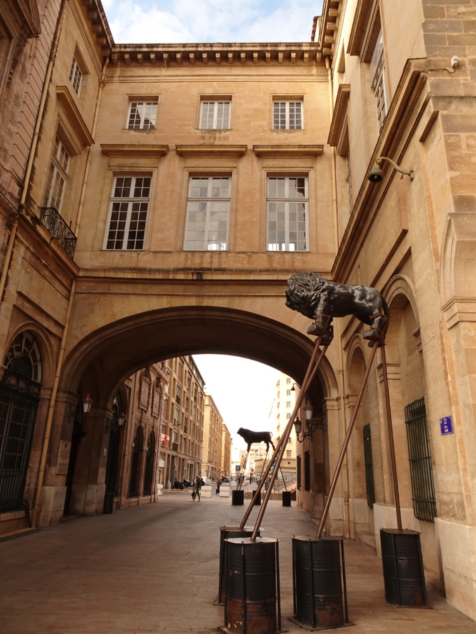 Achter het stadhuis staat een kunstwerk: een leeuw en een stier op 'stelten'. Op dat moment snapten we het niet, maar ondertussen zijn we er achter gekomen dat deze twee krachtige dieren in het wapenschild van Marseille staan.