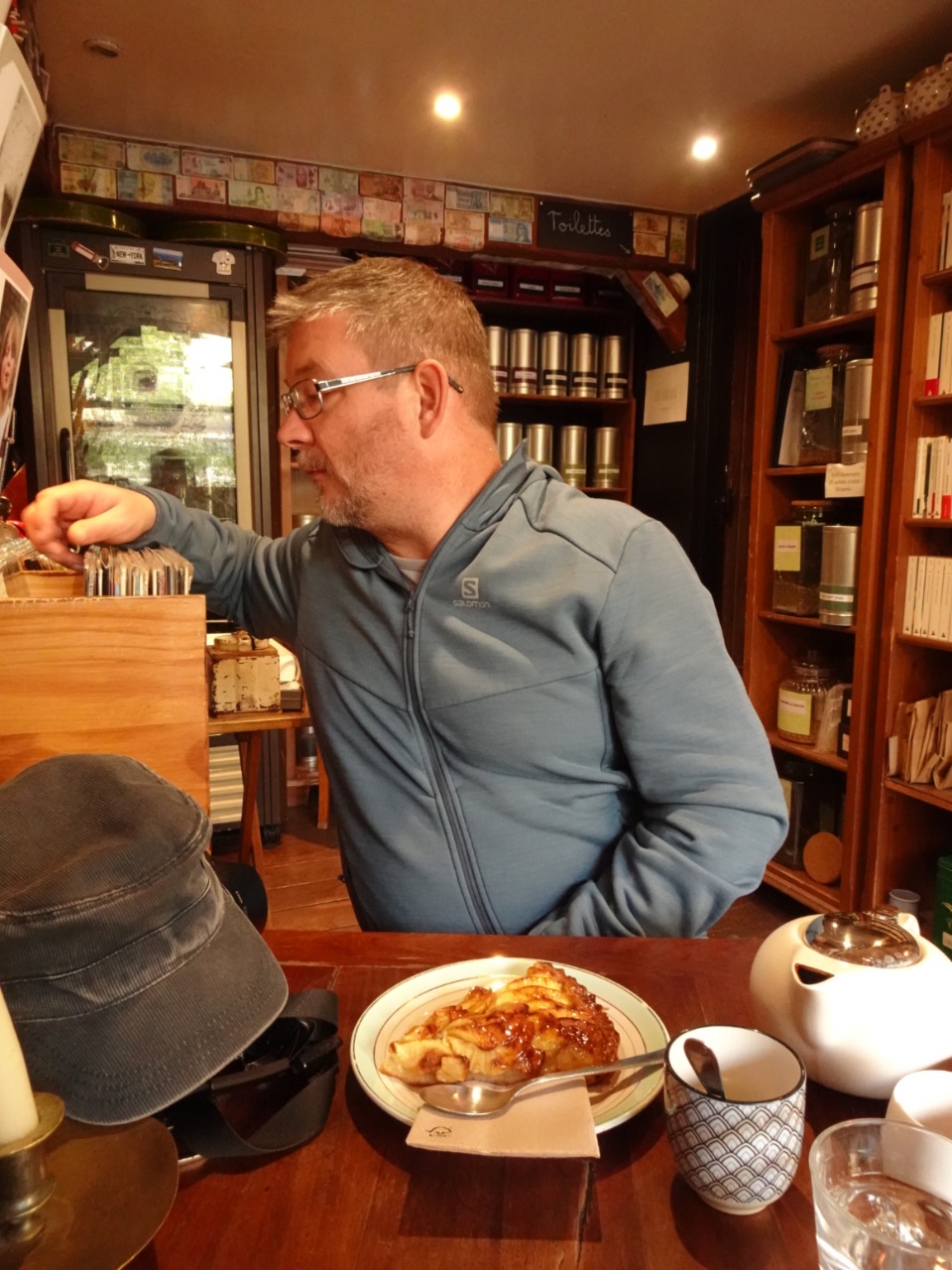 We hadden op voorhand al uitgezocht waar we koffie zouden gaan drinken met iets lekkers. Er waren mogelijkheden zat, maar op de route lag "cup of tea". Dit theehuis verkoopt namelijk ook boeken en platen... echt iets voor ons, dus! Johan dronk er een speciale (Afrikaanse) thee, Ine gewoon latte. Beiden aten we een goed groot stuk appelvlaai (met goed veel kaneel). Johan vond er een plaat die hij wel zou willen kopen, maar besloot dat hij er niet de rest van de dag mee wou rondlopen.