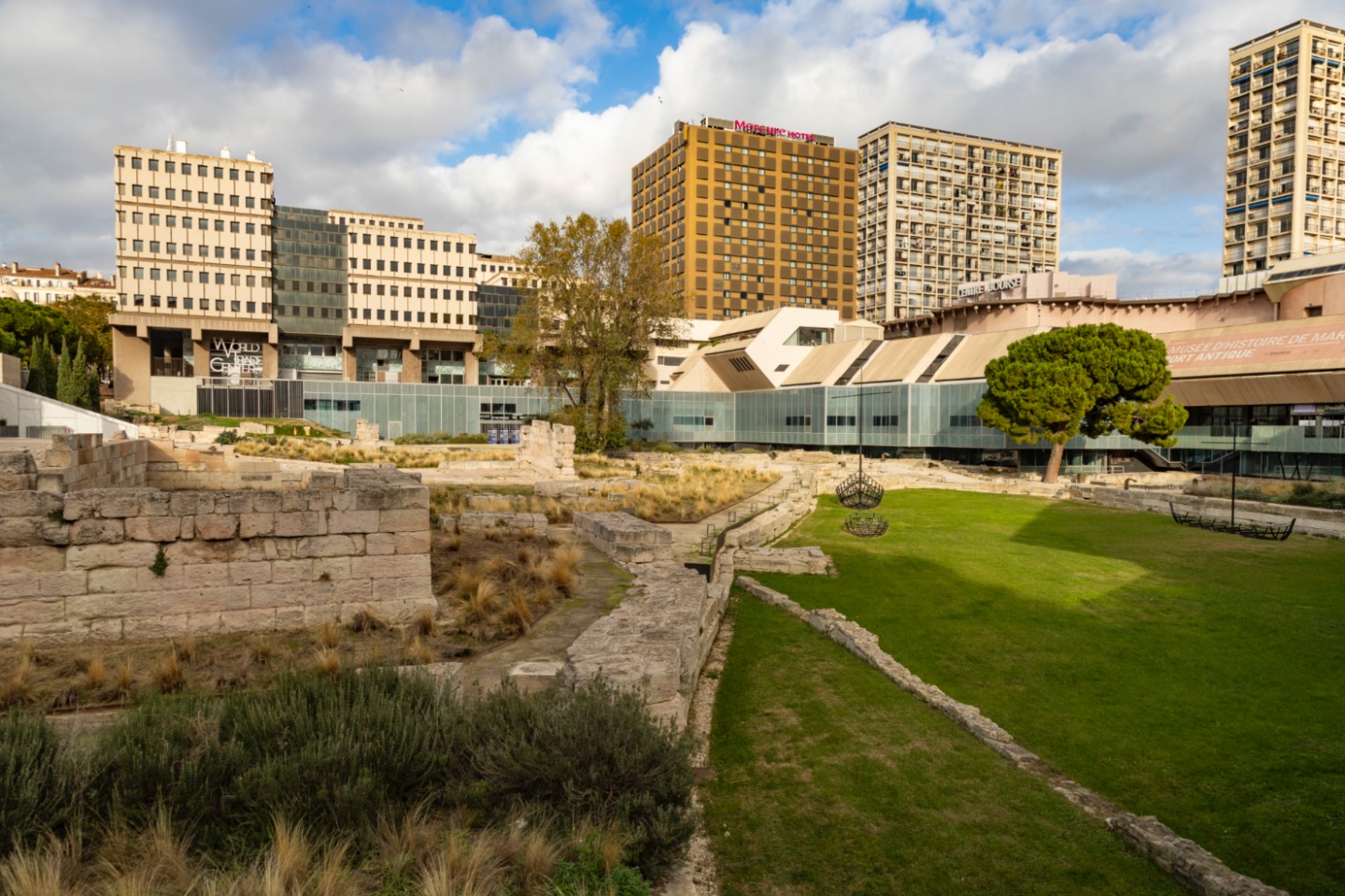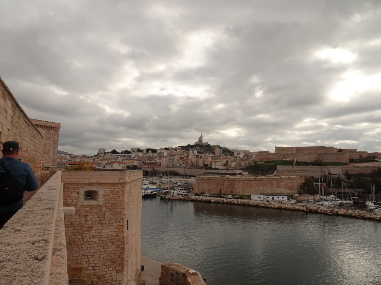 Van aan de kathedraal liepen we een groot hypermodern plein op. Hier staan enkele grote en blijkbaar bekende musea. Het laatste museum moesten we binnen, niet om het te bezoeken, maar van hieruit kan je, met een loopbrug, Fort Saint-Jean in lopen. In dit gerenoveerde fort keken wat rond.Naar Fort Saint-Nicolas, aan de andere kant van de oude haven gingen we niet. We vervolgden onze route en kwamen zo, nadat we ook even een koffiebreak hielden, bij het laatste punt van onze eerste route: resten van de oude Griekse havenstad Massilia.