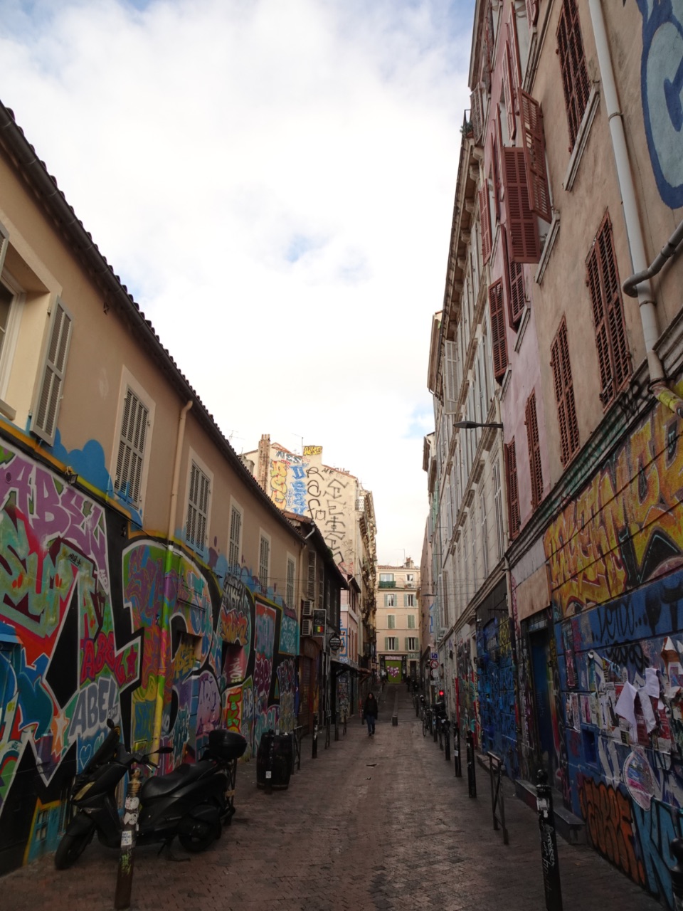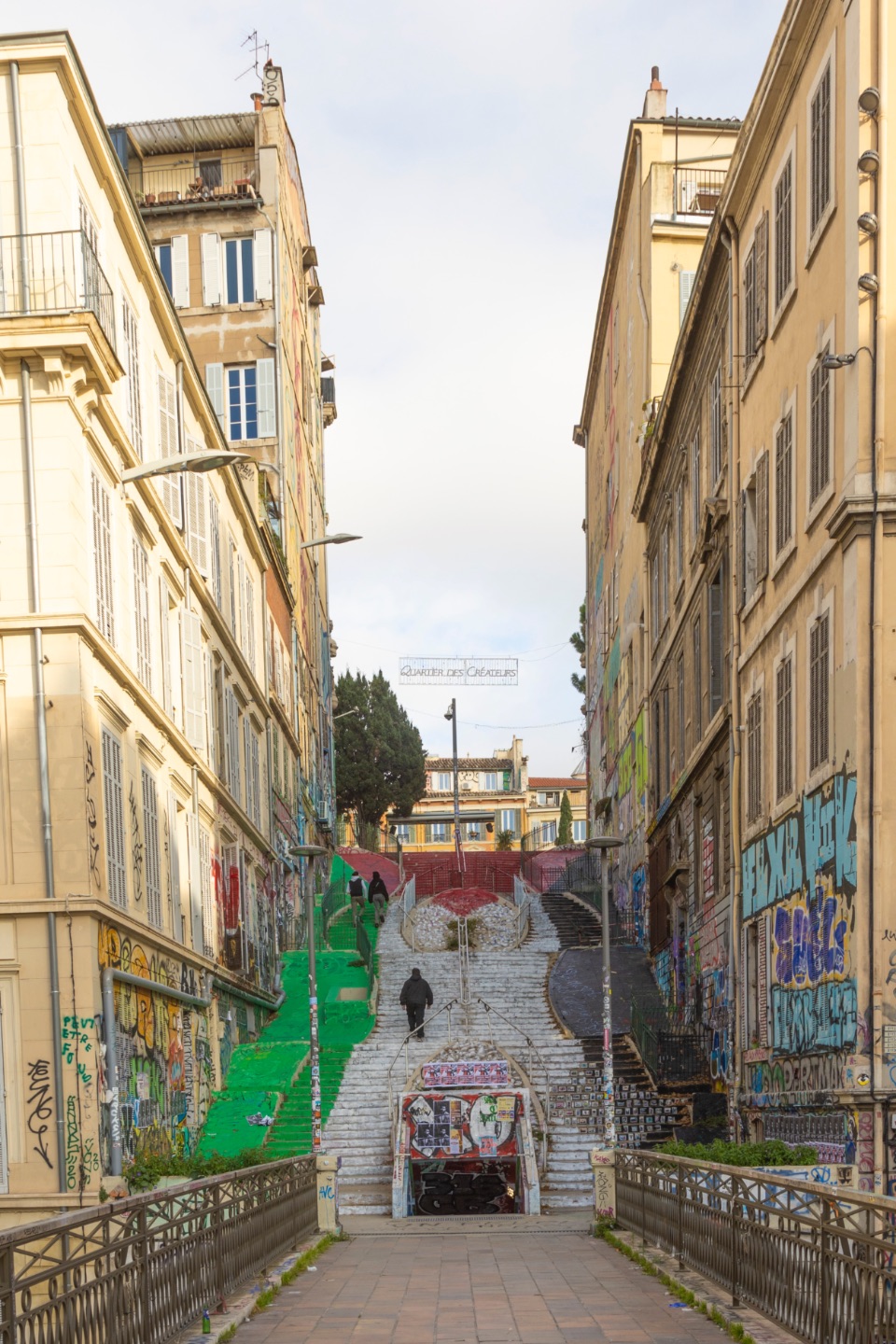 De lijfspreuk van Marseille is "we zijn allen van hier en van elders". In Noailles merk je dat meteen: het lijkt alsof je ineens in een andere stad bent door al de verschillende culturen die er samenkomen en in dezelfde straten winkeltjes en zaakjes hebben. We volgden de route langs verschillende zaakjes, maar er waren er veel van gesloten of we gingen er niet binnen, aangezien we niks nodig hadden.Dan kwamen we aan aan "Les escaliers du Cours Julien". Dat zijn de 'graffititrappen' die als toegangspoort tot de Cours Julien gezien worden. Onderaan de trappen is een metrohalte gevestigd, waardoor het dus eigenlijk ook echt een toegangspoort is.