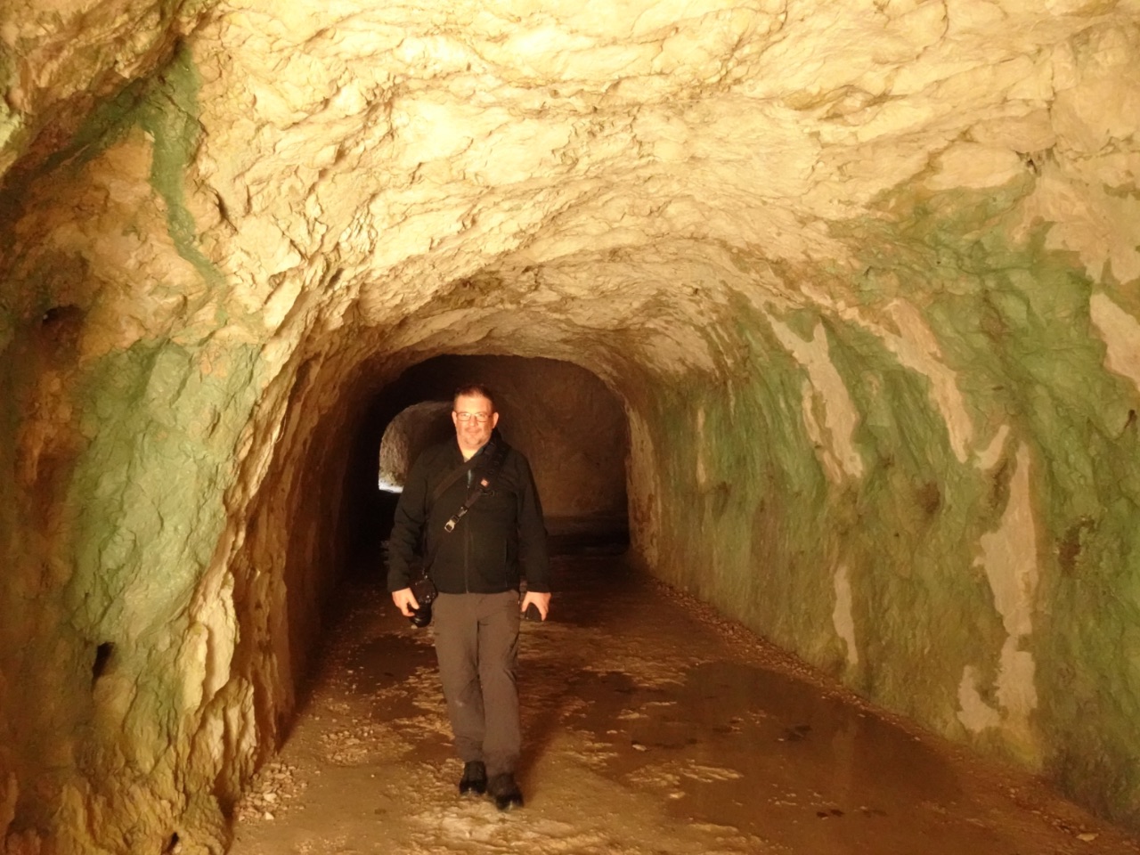 Al vrij snel kwamen we twee openingen in de tunnel tegen. Eentje gaf uitzicht op de rivier. De andere keek uit op een gigantische klif. Bij het verder wandelen, merkte Ine dat ze het erg benauwd kreeg: dat er gedeeltes onder water stonden en dat er over stapstenen gestapt moest worden, vond ze niet leuk en ook het feit dat er nu verderop geen licht meer te zien was, deed haar besluiten terug te gaan... Ine is een schrikscheet. Johan wandelde wel verder en maakte nog een keer onderweg door een opening en eens uit de tunnel nog enkele foto's.