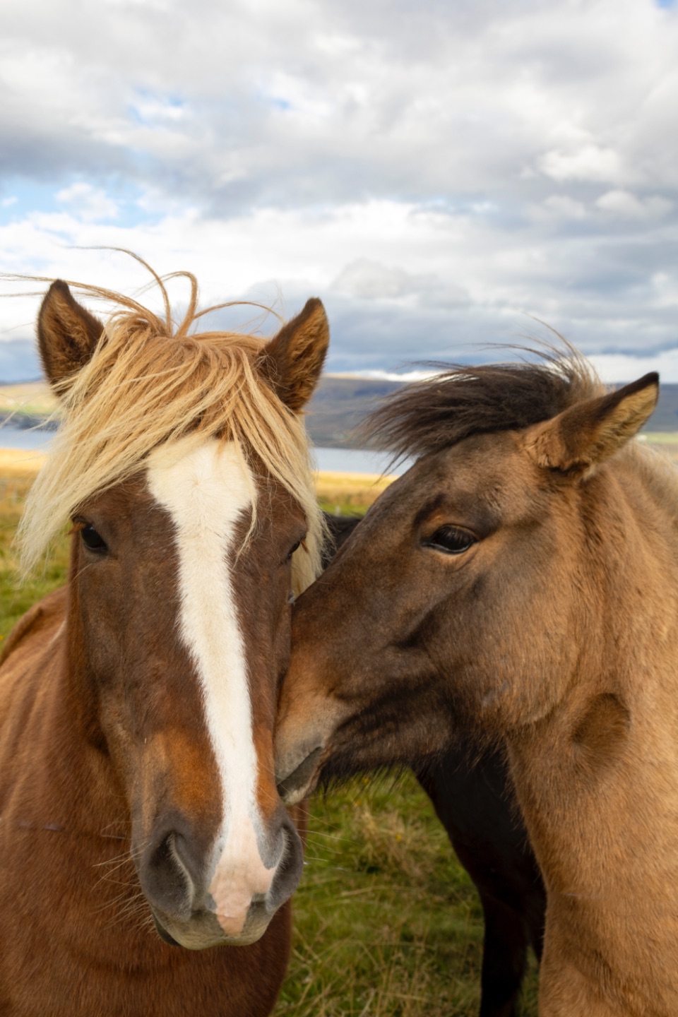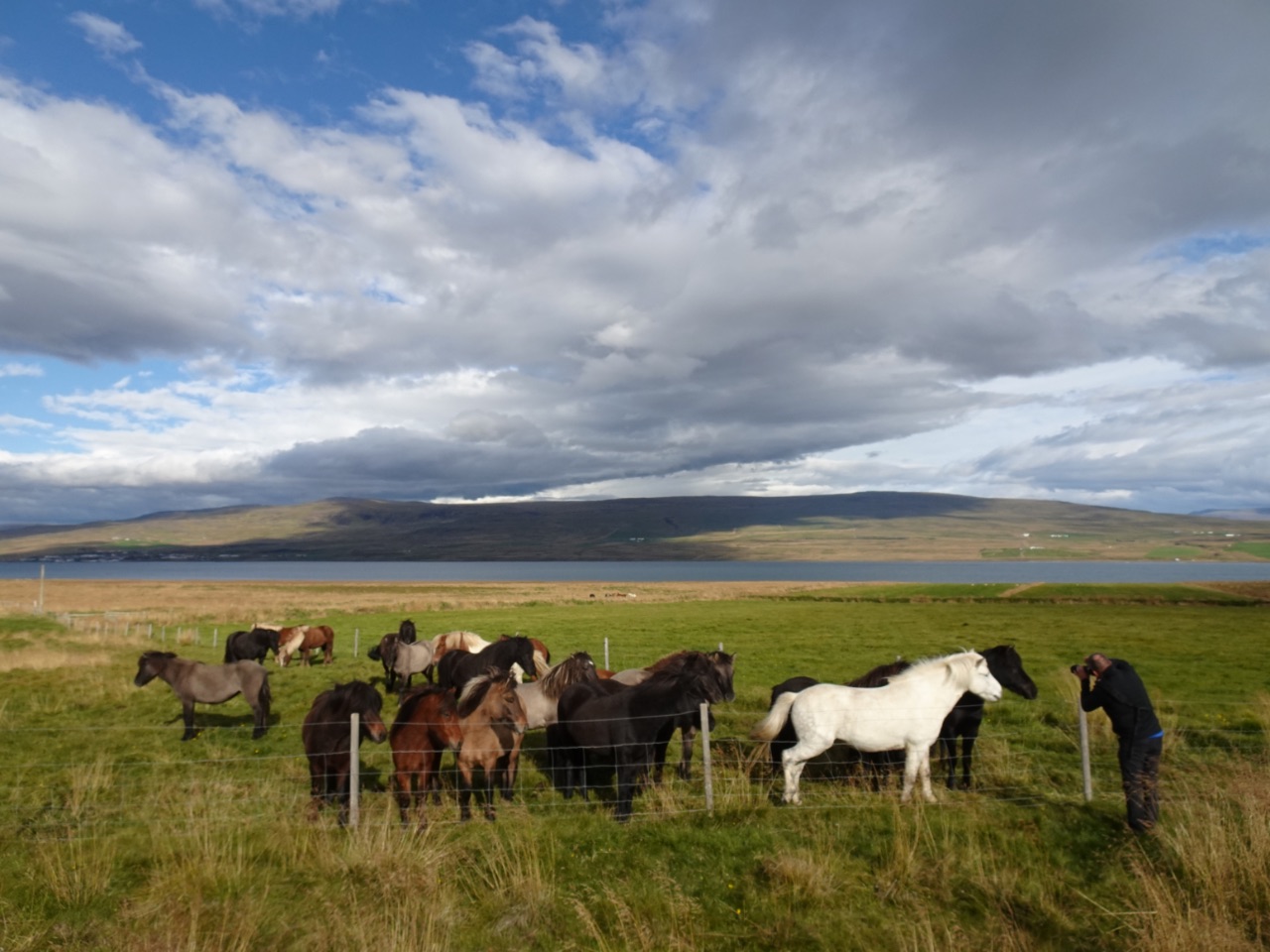 Het eerste schiereiland van de Arctic Coast Way waar we 's anderendaags (dag 3) mee zouden starten, verkenden we, door die extra tijd, al om op deze tweede dag te doen... en eigenlijk maar goed, want die derde dag zat wel erg vol... Dat eerste, het meest westelijke van regio Noord-IJsland, schiereiland is Heggstaðanes. We reden over gravelweg °702 van het westen naar het oosten van het schiereiland... en we ontdekten dat het schiereiland vrij 'vlak' is, één en al moerassig, graasland voor schapen, paarden en koeien. Het had eigenlijk heel de dag al gemotregend tot we hier reden. Boven het schiereiland trokken de wolken zelfs wat open. Johan vond het ideaal weer om nog eens wat IJslandse paarden, een apart ras, te fotograferen. Het bizarre aan het IJslandse licht is dat het soms érg fel is. Zo stond er een volledig wit paardje in de wei waarbij Johan stond dat leek wel fluorescerend te worden van het licht! Je kon er bijna niet naar kijken zó wit dat wit diertje was!