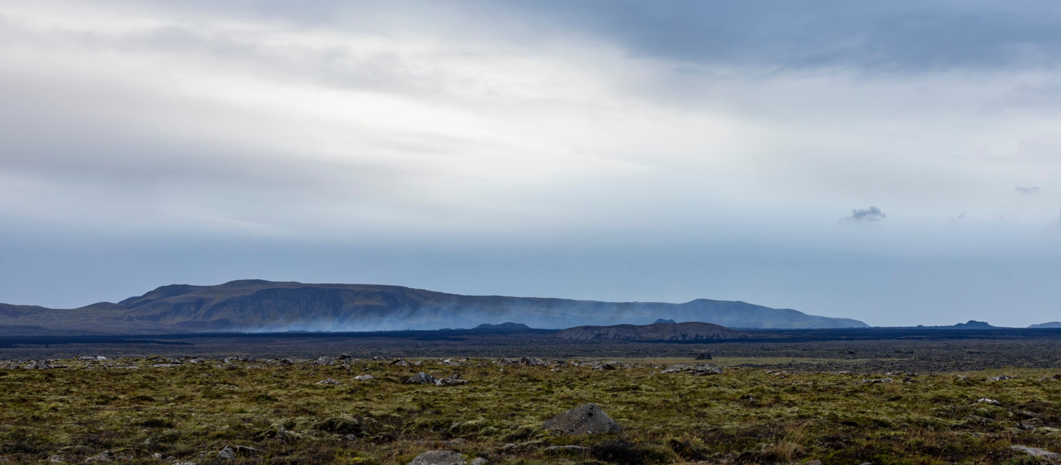 Op zondag 14 september waren we, vanwege het twee uur tijdsverschil in de zomer met thuis, vroeg wakker. We gingen dan ook vroeg ontbijten en vertrokken ook vroeg op onze tocht van het zuidwesten naar het noordwesten van IJsland. Door het druilerige weer stond er heel wat stoom op het nieuwe, nog hete lavaveld... mooi zicht!