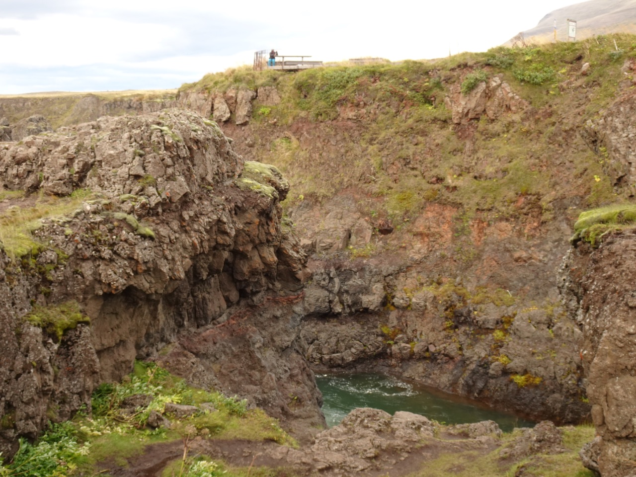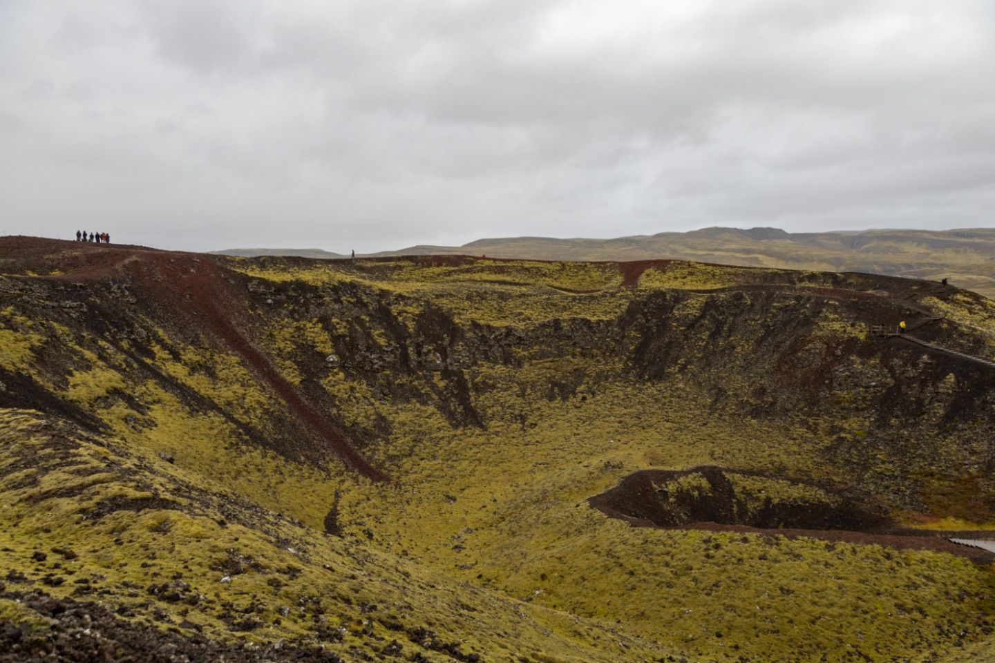 Net als in 2007 stopten we bij een kraterrij, als gevolg van een spleeteruptie eeuwen geleden. De kraterrij heet Grábrókargígar. Op een onderdeel hiervan, namelijk op krater Gábrók, kan je rond de kratermond wandelen. Hiervoor moesten we eerst veel trappen doen tot boven en dan hadden we een mooi uitzicht op de omgeving. Het was druilerig en bewolkt, maar gelukkig konden we nog best veel van de omgeving zien. Deze krater ligt vlak langs de IJslandse Ringweg. Dit was duidelijk te zien aan het aantal toeristen die op Grábrók rondwandelden en vooral geen rekening hielden met anderen... en dan is het in september redelijk rustig... :-( In 2007 hadden we de hele krater voor ons alleen... maar ja, toen ging IJsland in 2008 door de bankencrisis en koos het resoluut voor massatoerisme... blijft spijtig...