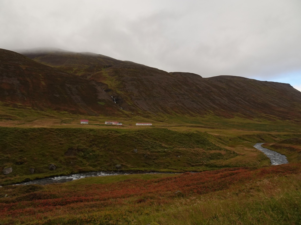 Verder volgden we wel onze planning: we reden verder door de tunnel naar Ólafsfjörður. In dit kleine dorpje stopten we niet. We reden meteen, via de hoogvlakte Lágheiði in plaats van de tunnels, terug naar het westen van het schiereiland. De eerste weg die Ine uitgekozen had op voorhand, zo maar lukraak door op de wegenkaart te kijken, was echt een slechte gravelweg. Eens op de weg van de bergpas viel het enigszins mee. Onderweg kregen we veel door de herfst gekleurde bergflanken en velden te zien. Ook zagen we, zoals steeds langs bergflanken af, veel smalle watervallen. Hoe verder we reden en het westen naderden, hoe droger en zonniger het weer werd. En eens van de gravelweg van de bergpas af konden we weer vlot rijden op de asfaltweg. Hierbij stopten we niet meer aangezien we 's ochtends dezelfde weg, maar naar het noorden, reden.