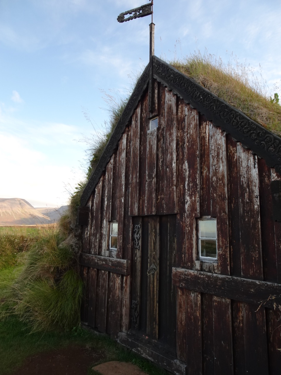 Twintig kilometers verder naar het noorden stopten we opnieuw, opnieuw bij een kerk... maar ook een bijzondere: Grafarkirkja is de oudste turfkerk (uit de 17e eeuw) die een ronde turfmuur rondom de kerk heeft. We vonden vooral het mooi afgewerkte ijzerwerk op de houten staafkerk en als windwijzer erg mooi.