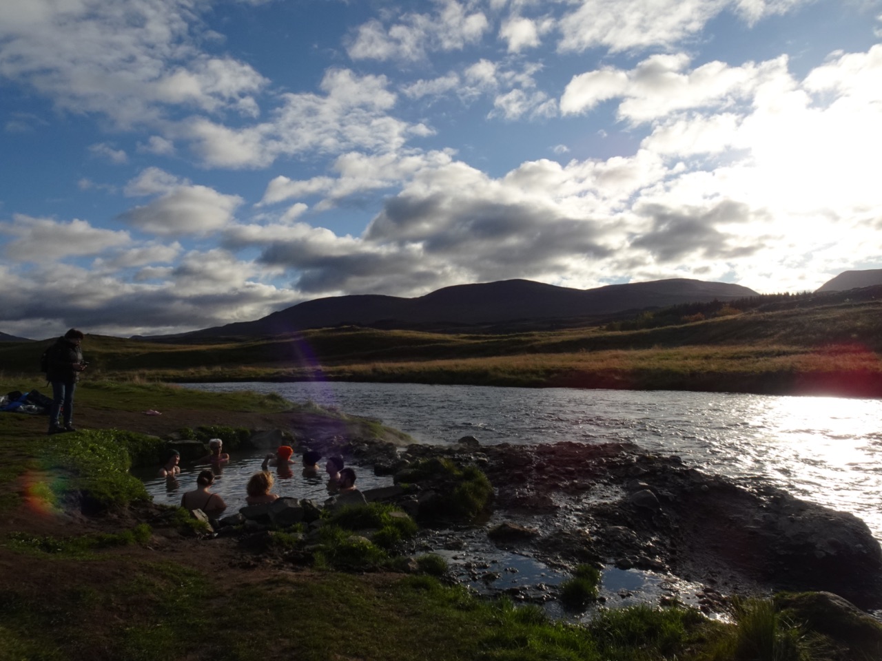 Een beetje stroomopwaarts van de waterval ligt een warme bron aan de oever van de rivier, "Fosslaug". We hadden ons zwemzakje bij maar hadden nog niet beslist of we gingen badderen... totdat we de drukte in en rond het badje zagen en hoorden... daar hadden we geen zin in. Daarnaast was er helemaal niks voorzien om je om te kleden. Dat er geen kleedkamers waren, wisten we, maar een houten schutting om je uit de wind te kunnen omkleden was toch wel echt het minimum geweest... zeker voor die €10! Fosslaug was dus een teleurstelling voor ons... rustig gaan badderen, ging er gewoon niet...
