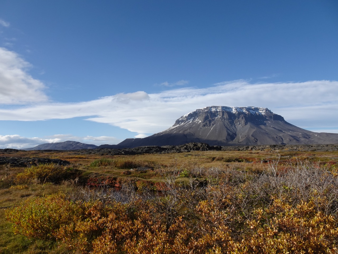 De chauffeur legde uit dat de Herðubreið de vorm heeft die ze heeft doordat de vulkaan onder het vroegere gletsjerijs uitbarstte. Haar naam betekent letterlijk ‘de breed geschouderde’ maar door de IJslanders wordt ze vooral de koningin onder de bergen’ genoemd. Bovenop de berg staan basaltkolommen die lijken alsof ze een kroon draagt. Daar bovenop ligt een schildvulkaan. Als je kijkt waar de schildvulkaan begint, zo lazen we, moet het ijs tenminste 1500 meter hoog hebben gelegen toen de Herðubreið ontstond. Schildvulkanen ontstaan namelijk boven ijs of water, nooit eronder. In totaal is de Herðubreið zo'n 1682 meter hoog. Haar laatste uitbarsting was in het pleistoceen, tienduizenden jaren geleden inmiddels.