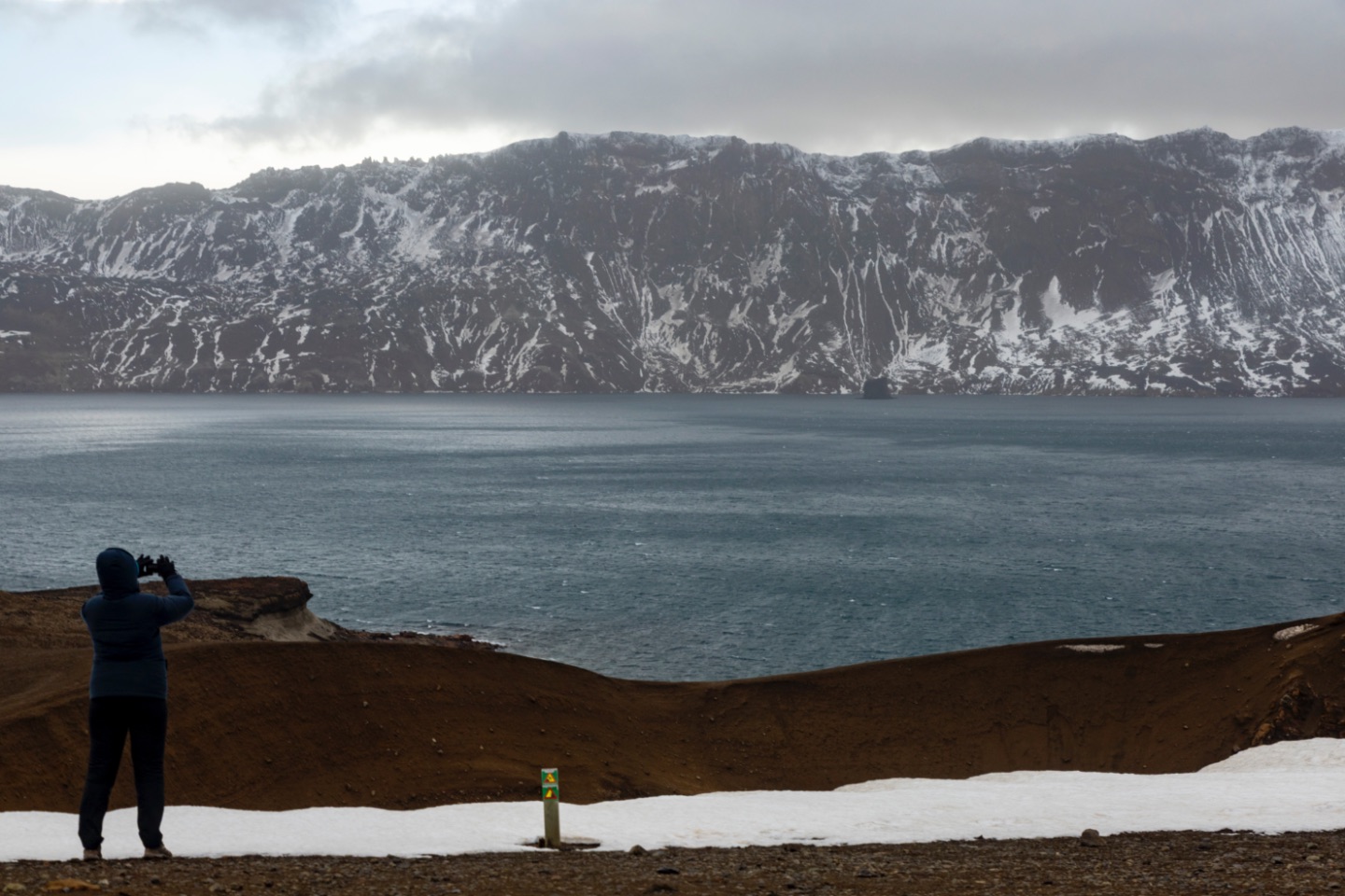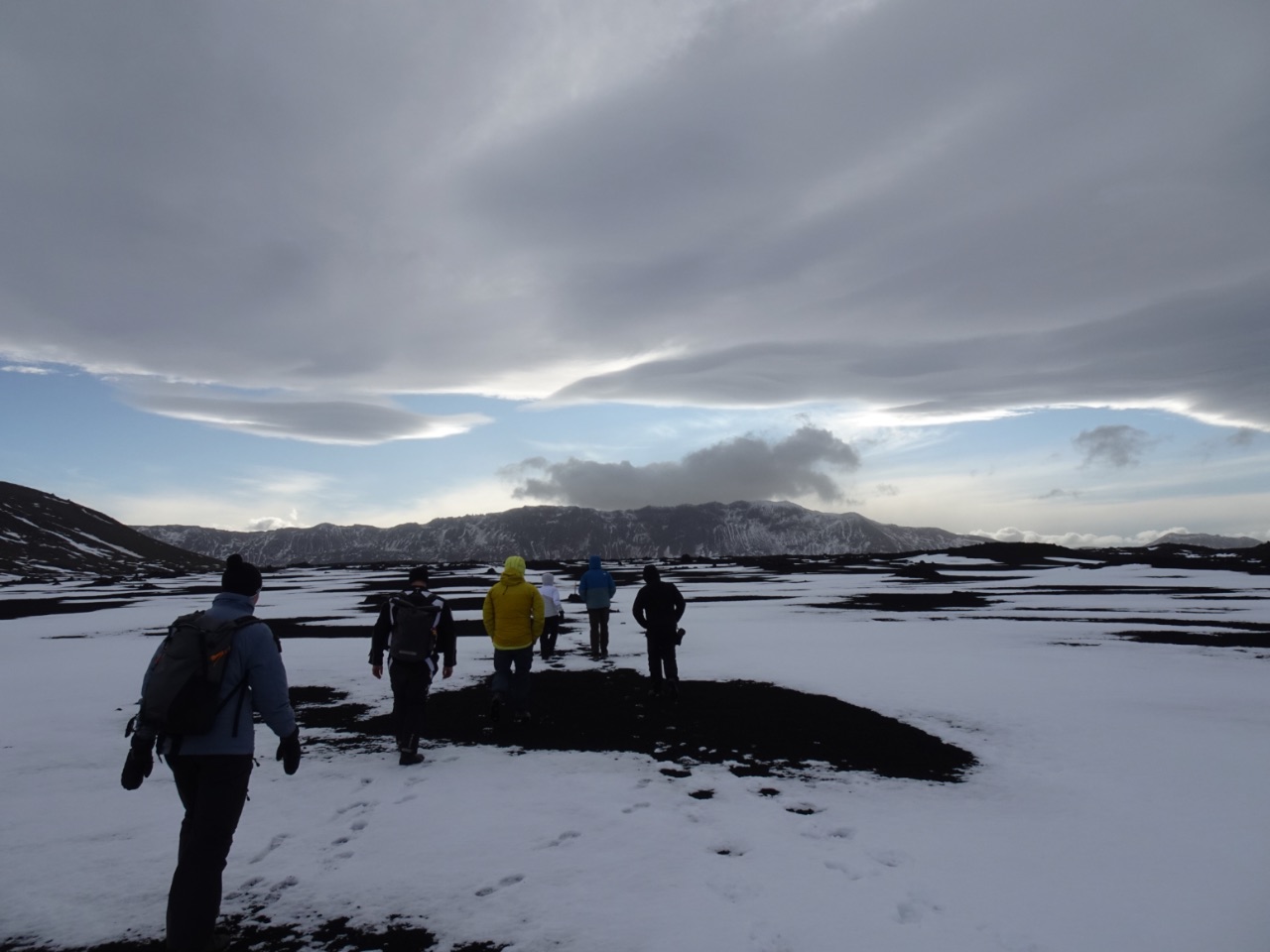 Nadat we een klein stukje omhoog gewandeld hadden, vertelde de gids dat álles dat we zagen, de gitzwarte vlakte en de daarrondliggende zwarte bergwanden (beide met 'vlekken' sneeuw), de caldera was... wowww! niet te vatten hoe groot dat dat was! Deze buitenste grote caldera van Askja dateert uit zeer vroeger tijden en is ongeveer 45 à 50 km² groot!
