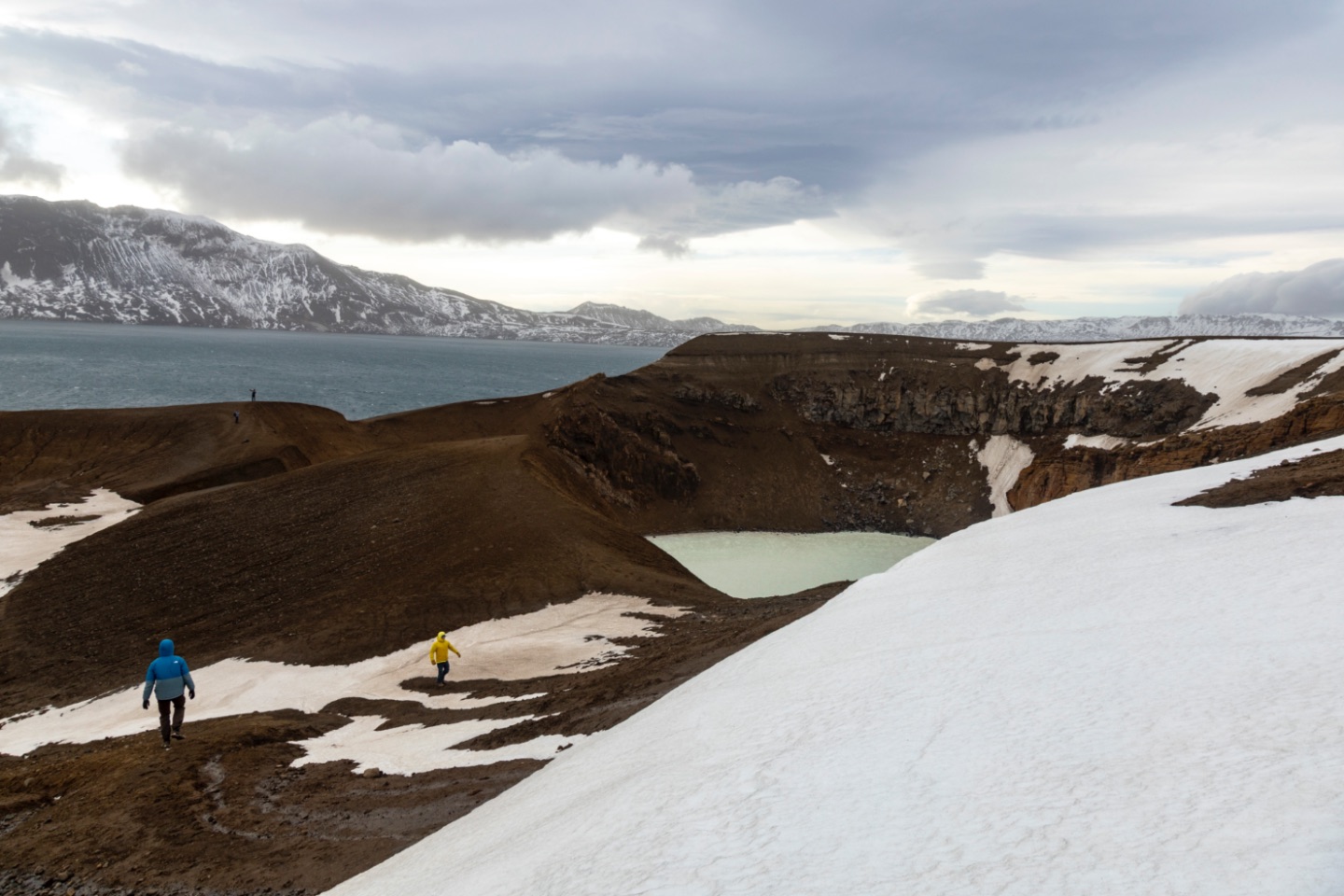 Na het eten reden we nog zo'n acht kilometer verder, naar de parkeerplaats bij Askja. Van daaruit is het een klein stukje wandelen naar de Askja caldera en een half uurtje tot de kratermeren Öskjuvatn en Víti. Er kan niet verder gereden worden omdat men niet geheel zeker is over hoe stevig de caldera is... en zo'n superjeeps wegen natuurlijk wel iets.