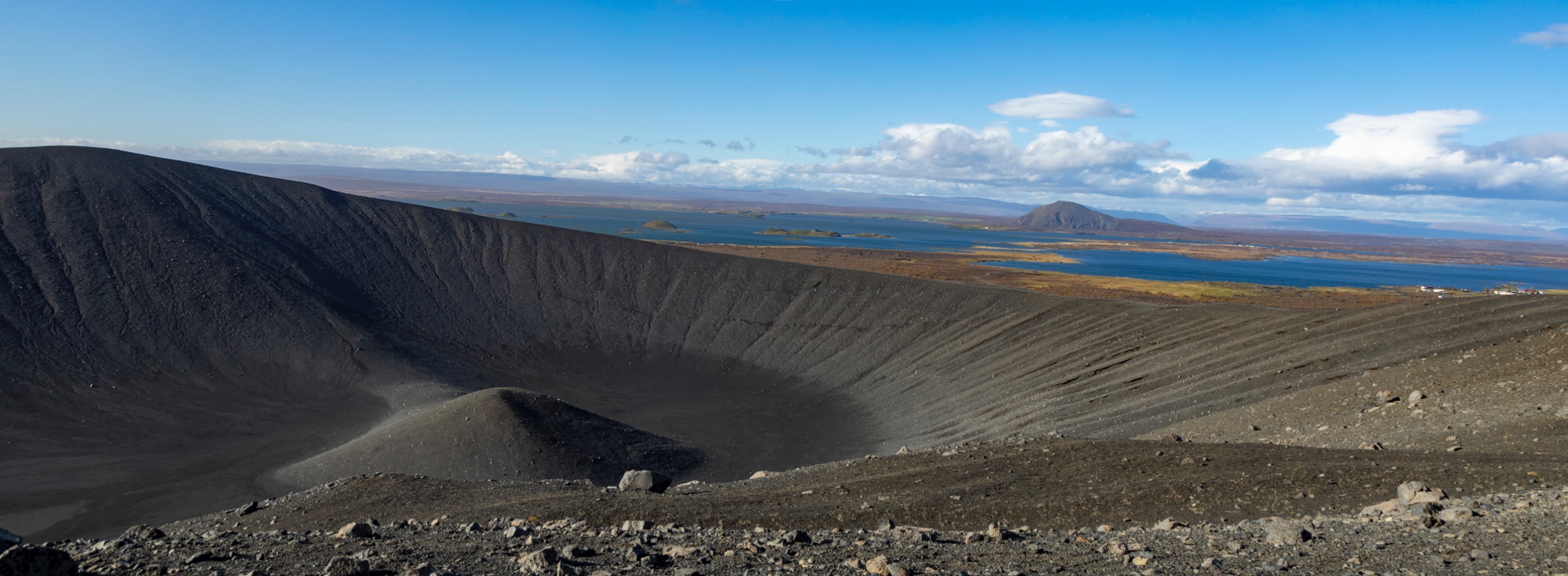 Johan stuurde al snel bericht dat de klim naar boven op de Hverfjall aan de kant van Dimmuborgir afgesloten was. Hij moest naar de andere, minder steile, kant wandelen om de vulkaan op te gaan. Die vulkaan is enorm groot en heeft een diameter van een kilometer. Het duurde dus even vooraleer hij kon beginnen klimmen. Die klim was goed aangelegd met een stabiele ondergrond en een geleidelijke steigingsgraad. Johans plan was voordien om aan de ene kant Hverfjall op te gaan, over de kraterrand naar de andere kant te gaan en daar weer naar beneden te gaan. Met die afgesloten zuidflank wandelde hij nu helemaal rond over de kraterrand. Die extra afstand maakt Johan niet zo uit en zo zag hij ook de oostkant van de krater, niet enkel de westkant waar hij een mooi uitzicht op Mývatn had.