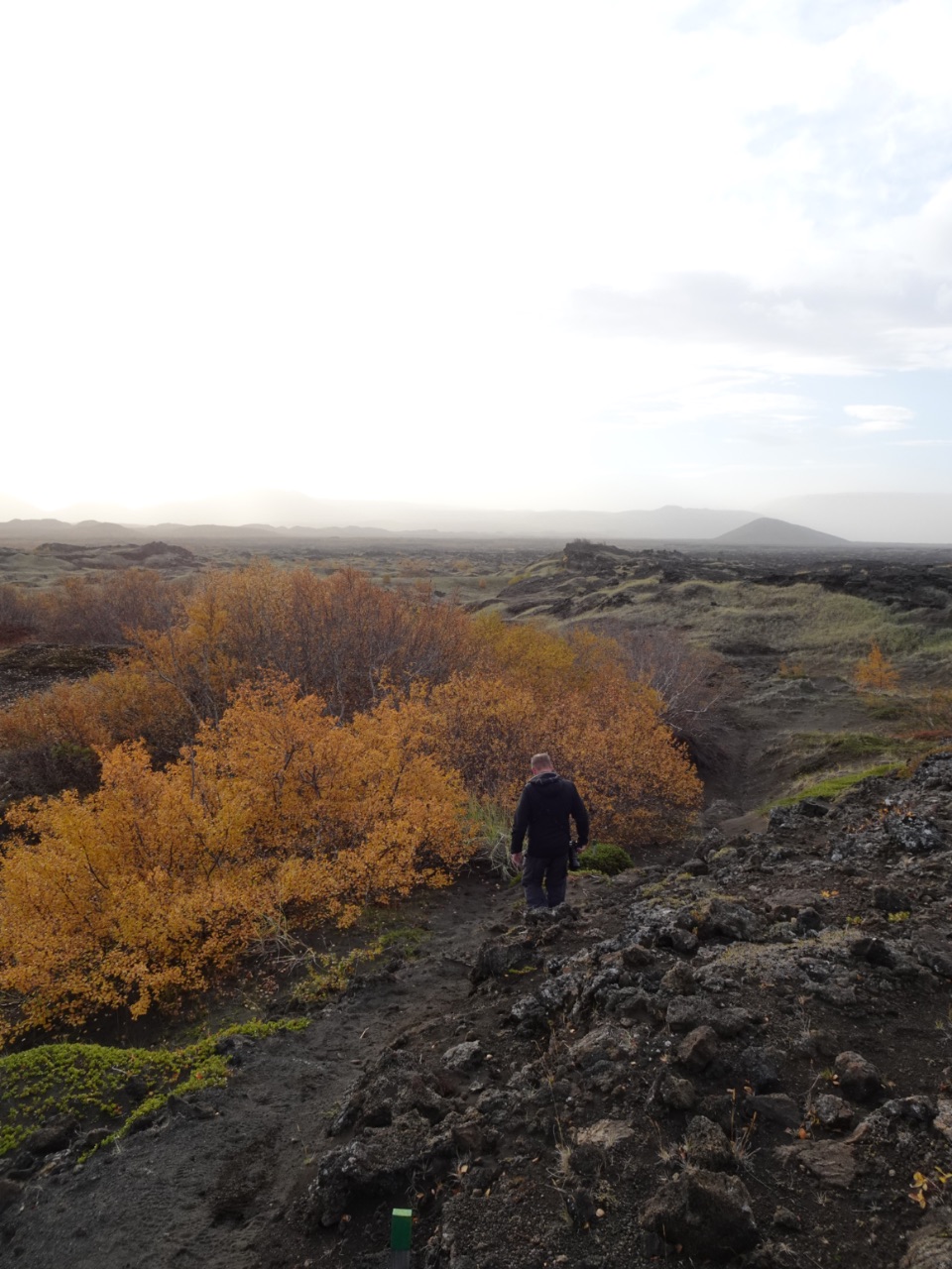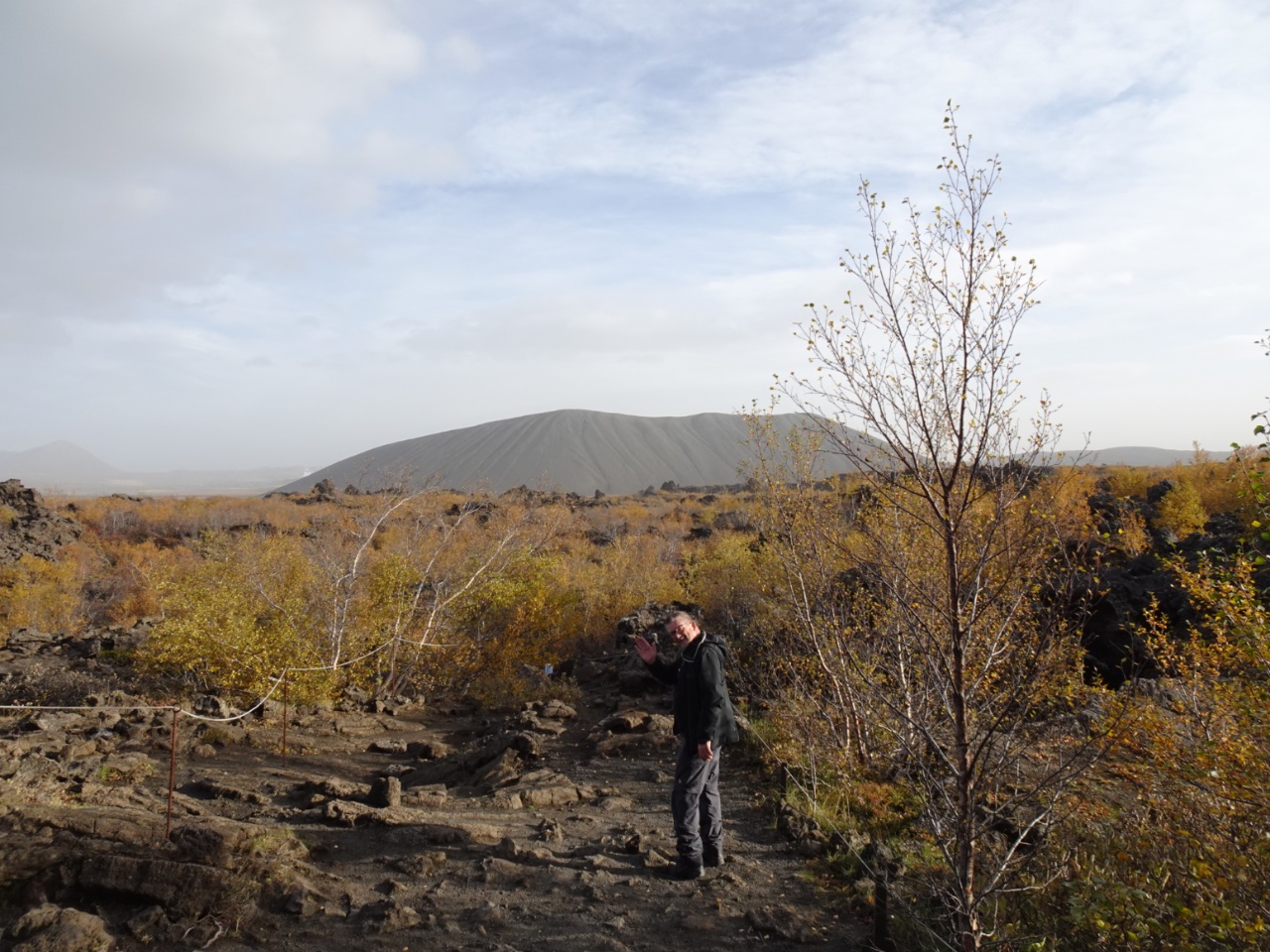 Na een hele tijd samen gewandeld te hebben, was het tijd om ieders een andere kant op te gaan: Ine bleef nog in Dimmuborgir. Johan wandelde naar de zwart-grijze kegelvulkaan Hverfjall. In 2007 wandelden we er allebei heen en op. Aangezien de vulkaan 312 meter hoog is en uit tefra, as en fijn gruis bestaat, geraakt Ine daar niet meer op (of kan ze nadien voor de rest van de dag niks meer doen). In 2007 was het letterlijk twee stappen omhoog zetten en eentje terug naar beneden zakken in de losse steentjes.
