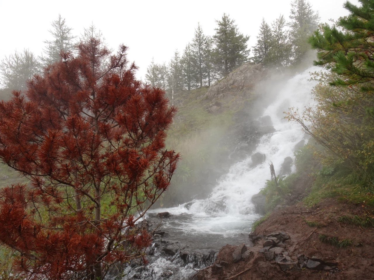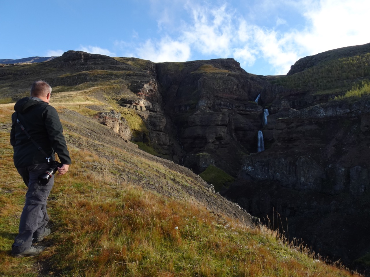 Daarna vervolgden we onze route, met de auto natuurlijk, op de Hringvegur. Hierbij reden we tussen de bergen door doorheen twee dalen, Öxnadalur en Hörgárdalur. De meeste bergtoppen zijn er afgerond en begroeid met mos. Enkele bergtoppen, tussen de twee dalen, zien er echter helemaal anders uit: zij zijn piekerig, woester en kaal... en die vinden wij het mooist. De puntigste piek wordt Hraundrangi genoemd.Na het stadscentrum van Akureyri, de hoofdstad van het noorden, gepasseerd te zijn, stopten we bij "Foss". 'Foss' betekent waterval. Het is gebruikelijk dat er, als naam voor een waterval, ook nog iets vóór komt. In dit geval is dat (nog) niet zo. Wat bijzonder is aan deze waterval is dat ze een warme waterval is. Ze is niet natuurlijk ontstaan, maar ontstond enkele jaren geleden tijdens de bouwwerken van de toltunnel Vaðlaheiðargöng tussen Akureyri en het verdere oosten. Tijdens die werken werd een groot ondergronds geothermisch veld aangeboord met een groot lek als resultaat. Het hete water wordt nu in de richting van de fjord Eyjafjörður afgeleid en valt er van de kliffen af. In de waterval over de bergflank zijn verschillende natuurlijke plateautjes ontstaan waarin je kan badderen. Doordat er enkele stroompjes aansluiten op de waterval wordt het hete water afgekoeld.