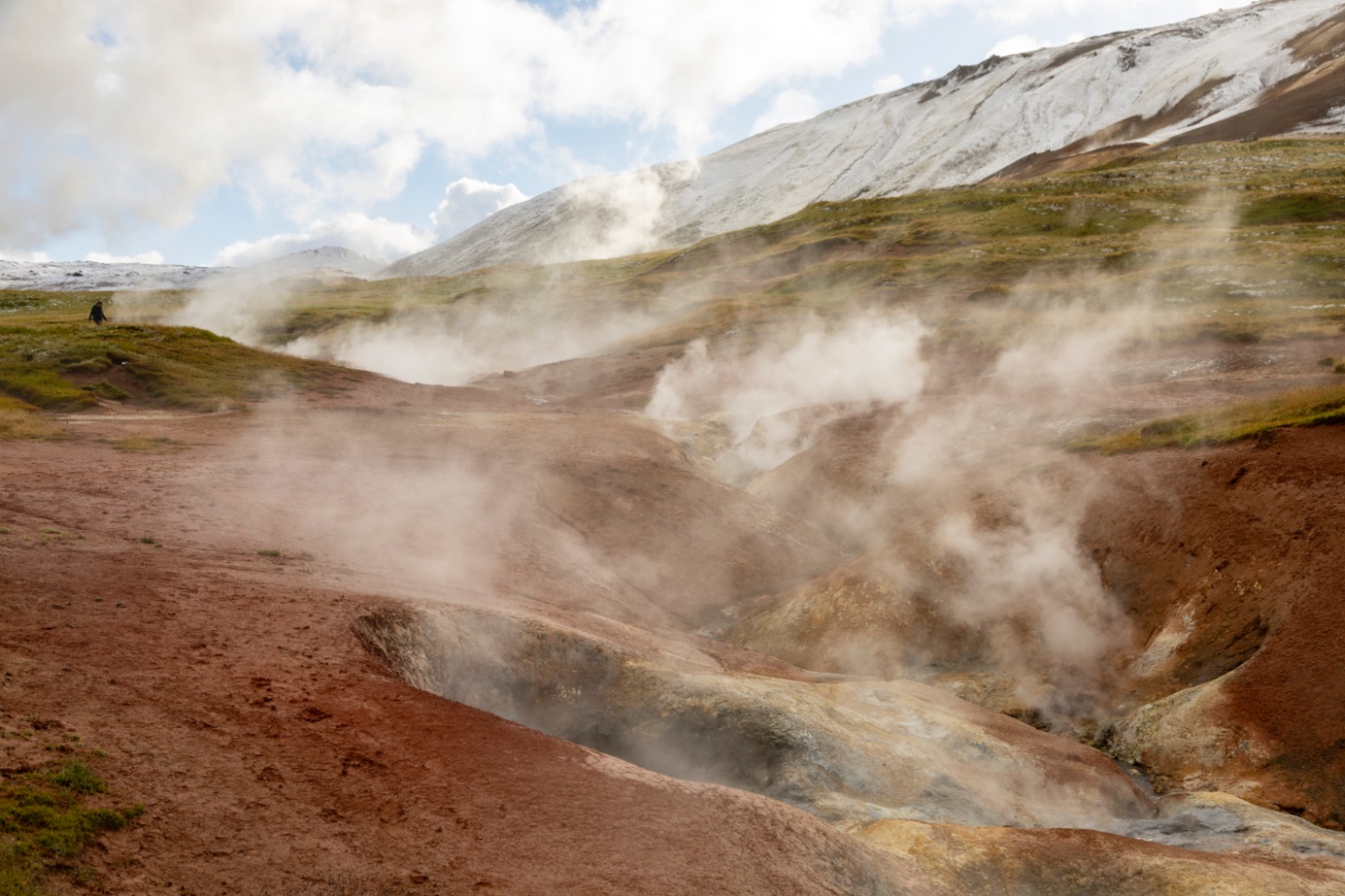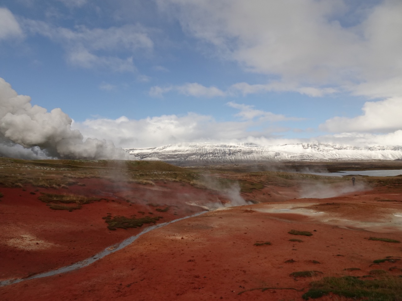 Aan de vele stoom zagen we dat we in de buurt van de geothermische fabriek kwamen... en hoe dichterbij we kwamen hoe meer kleur we ook weer te zien kregen. In deze gebieden was de aarde immers warm of heet waardoor daar de sneeuw niet bleef liggen.