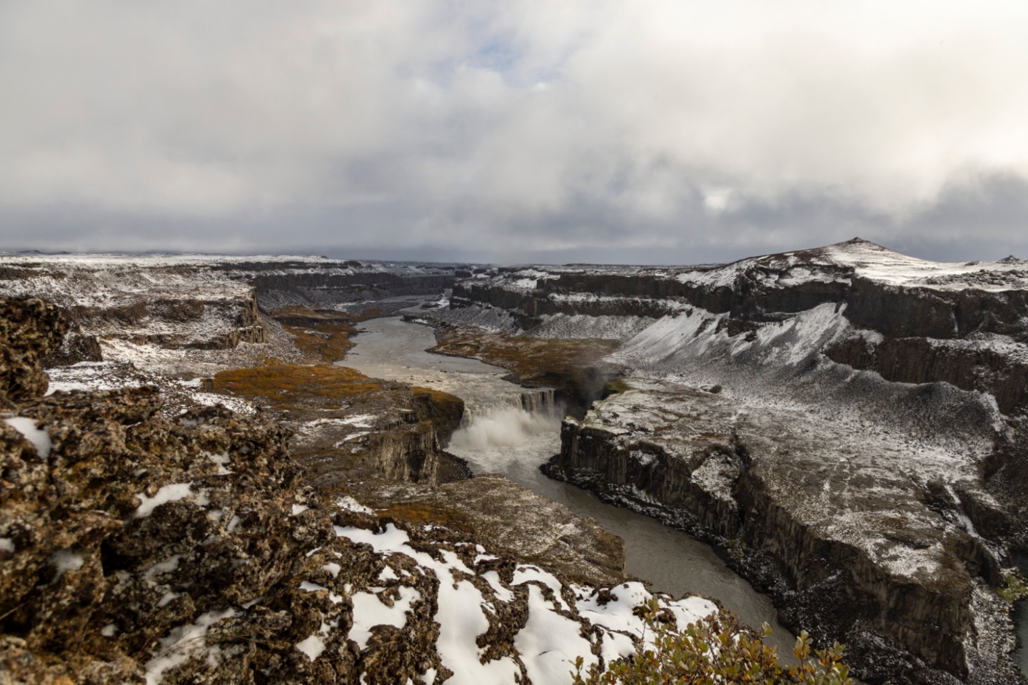 Dit was de eerste keer dat we deze 27 meter hoge waterval en z'n omgeving zagen. Aan de Hafragilsfoss zie je, zowel stroomop- als -afwaarts, veel van de canyon en oevers waardoor en -langs de Jökulsá á Fjöllum raast. Mooi! In de canyon waaide het wel flink.