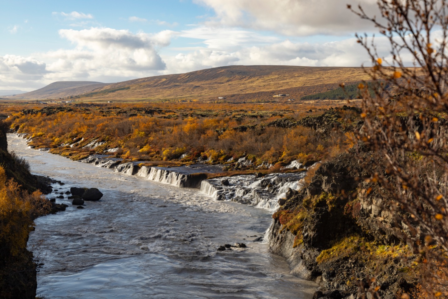 In Reykholt reden we even het kleine centrum in... en besloten toen al snel dat er écht niks te zien is ;-) Maar we passeerden er toch, op weg naar, ook voor de zoveelste keer, Hraunfossar... de mooie waterval zonder rivier... Over een afstand van meer dan 900 meter lijken vele waterstroompjes vanuit een lavaveld in de rivier te stromen. Dit lavaveld ontstond door een uitbarsting van een vulkaan die nu onder de Langjökull gletsjer ligt. Omdat de lava poreus en waterdoorlaatbaar is, en op een harde en waterdichte ondergrond ligt, stroomt smeltwater en regenwater tussen het lava en de harde ondergrond naar beneden totdat het in de Hvítá stroomt.