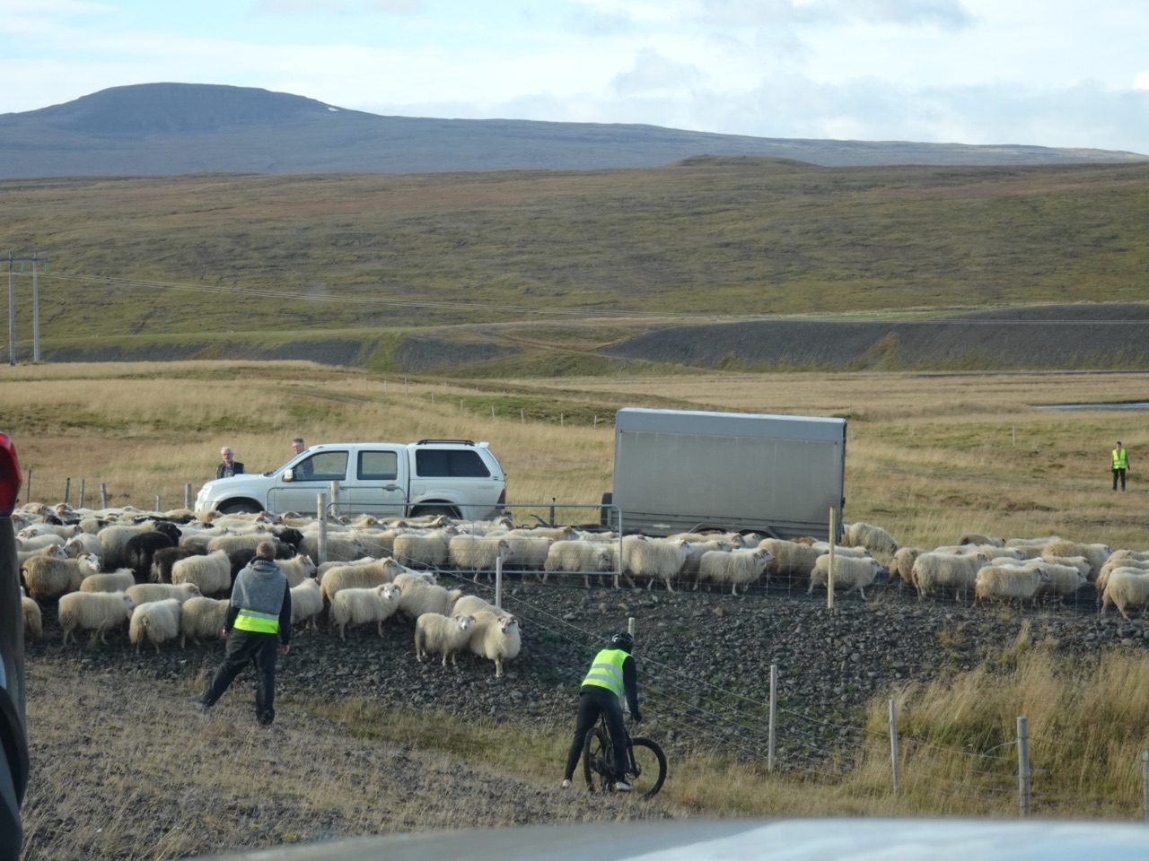 Er waren al veel schapen bijeengedreven. Ze liepen steeds heen en weer over de weg. Het verkeer werd dus tegengehouden. Wat bijzonder was, was dat de bestuurder vóór ons en de vrachtwagenchauffeur achter ons uitstapten en de dorpsgenoten mee gingen helpen!