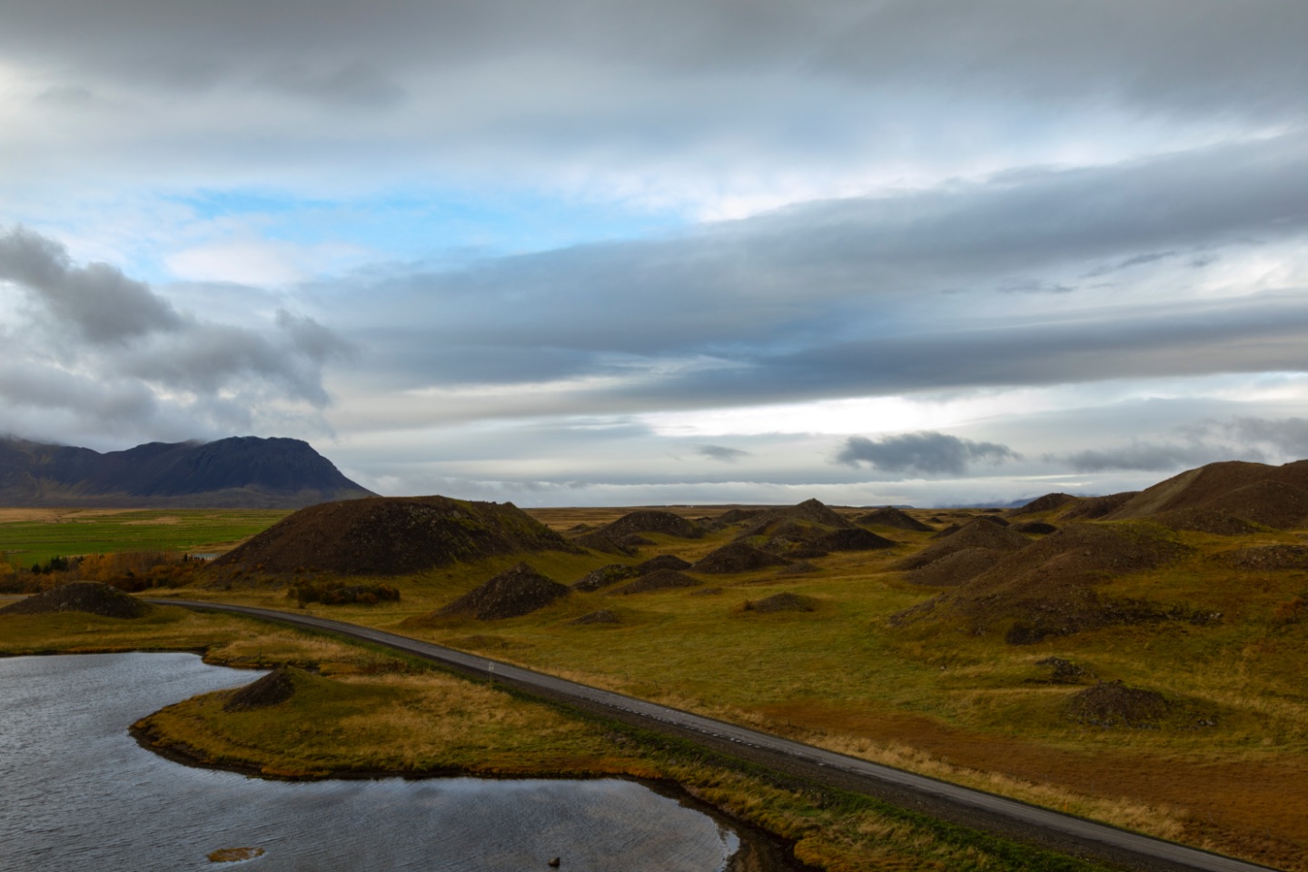 Na een twintigtal kilometer reden we de Ringweg al af en gravelweg °722 op. Hiermee reden we het Vatnsdalur in. Dit dal is een mooi, groen dal en er stroomt (zoals heel vaak op IJsland) een riviertje doorheen. Vatnsdalur wordt gekenmerkt door de zogenoemde ontelbare heuvels ("Vatnsdalshólar"). Deze kraterachtige heuvels lijken op pseudokraters maar zijn een heel ander natuurlijk fenomeen: Dit verschijnsel heeft zijn oorsprong in de veelvuldige aardverschuivingen vanaf de berg Vatnsdalsfjall. De meeste heuvels, die gezamenlijk een oppervlak van 40 km² beslaan, ontstonden door aardverschuivingen in het tijdperk van voor de kolonisatie van IJsland... bijzonder en erg fotogeniek... en blijkbaar óók tot de verbeelding sprekend. Er is een hele saga over het dal. Op die plek werden overigens ook, in 1830, de twee laatste terechtstellingen van IJsland uitgevoerd: twee moordenaars werden er... vermoord... én de plaatselijke herdershond kwam even vriendjes maken met Johan...