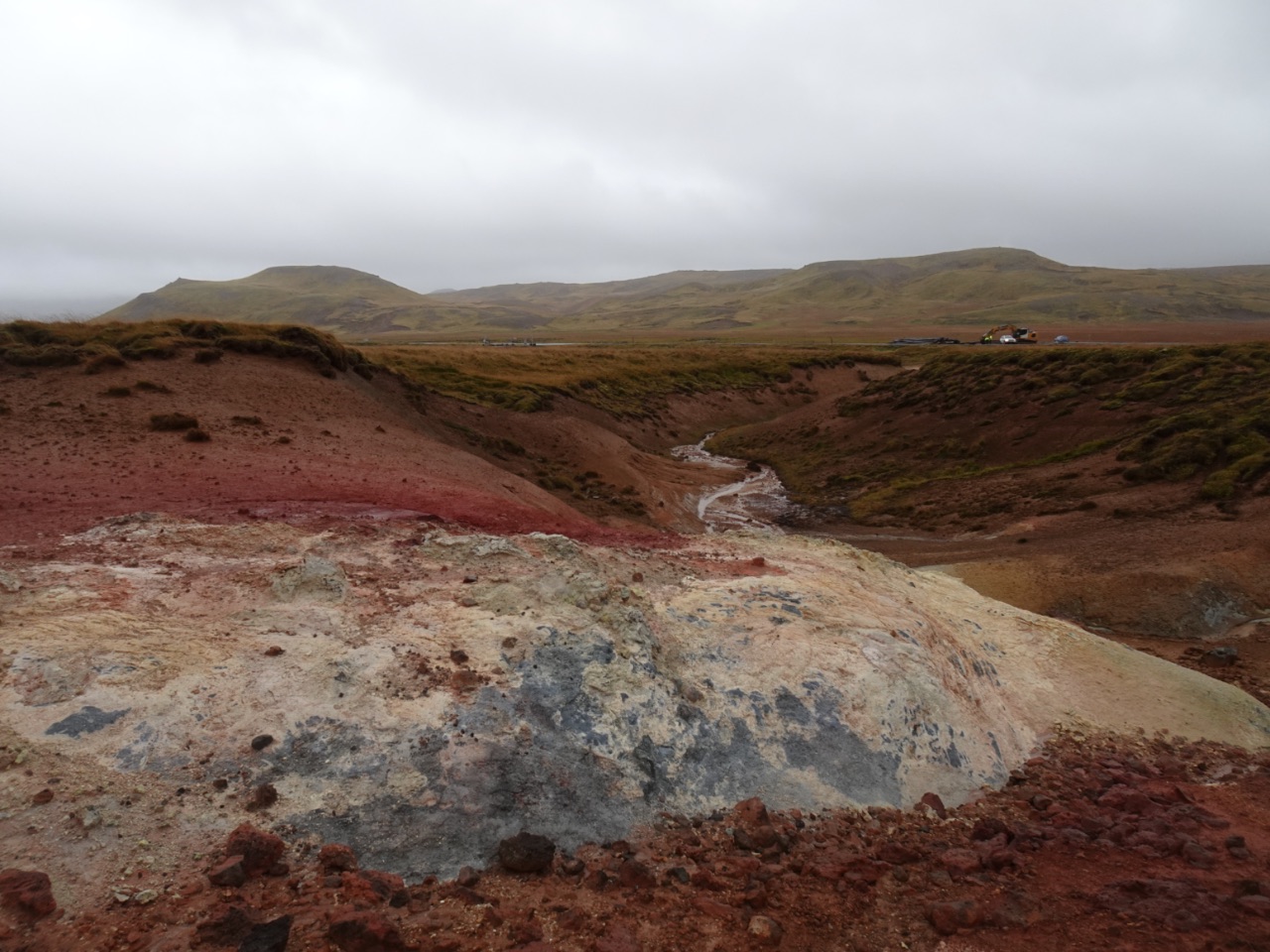Ietsje verder dan Krýsuvík stopten we bij Grænavatn. Dit meertje kleurt normaliter groening door het hoge zwavelgehalte in het water. Het zag er nu, mogelijk door de zware bewolking, eerder blauwig uit. Terwijl we er op de parking stonden, merkten we een geothermisch veld in de heuvels voorbij Krýsuvík op. Dit was ons nog nooit opgevallen óf is nieuw... wat kan want, net als de rest van Reykjanes, is ook het vulkaansysteem Krýsuvík, waar we waren, best actief.