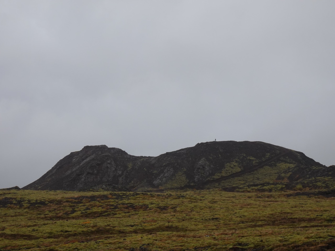 De plek die we bezochten wordt ook "Stóra-Eldborg", Grote Eldborg genoemd. En wel omdat het veruit de hoogste van vijf kraters van een spleeteruptie is die langs de hellingen van tafelberg Geitahlíð liggen. Ine nam genoegen met het zicht van de omgeving. Johan ging de krater wel op. Bovenop de krater liep de kratermond steil en diep naar beneden. De lava had er verschillende kleuren. Johan had er een mooi uitzicht over de omgeving, onder andere op Litla-Eldborg (Kleine Eldborg) een kleinere krater van diezelfde spleeteruptie/kraterrij.