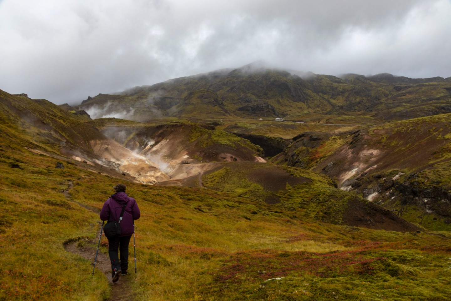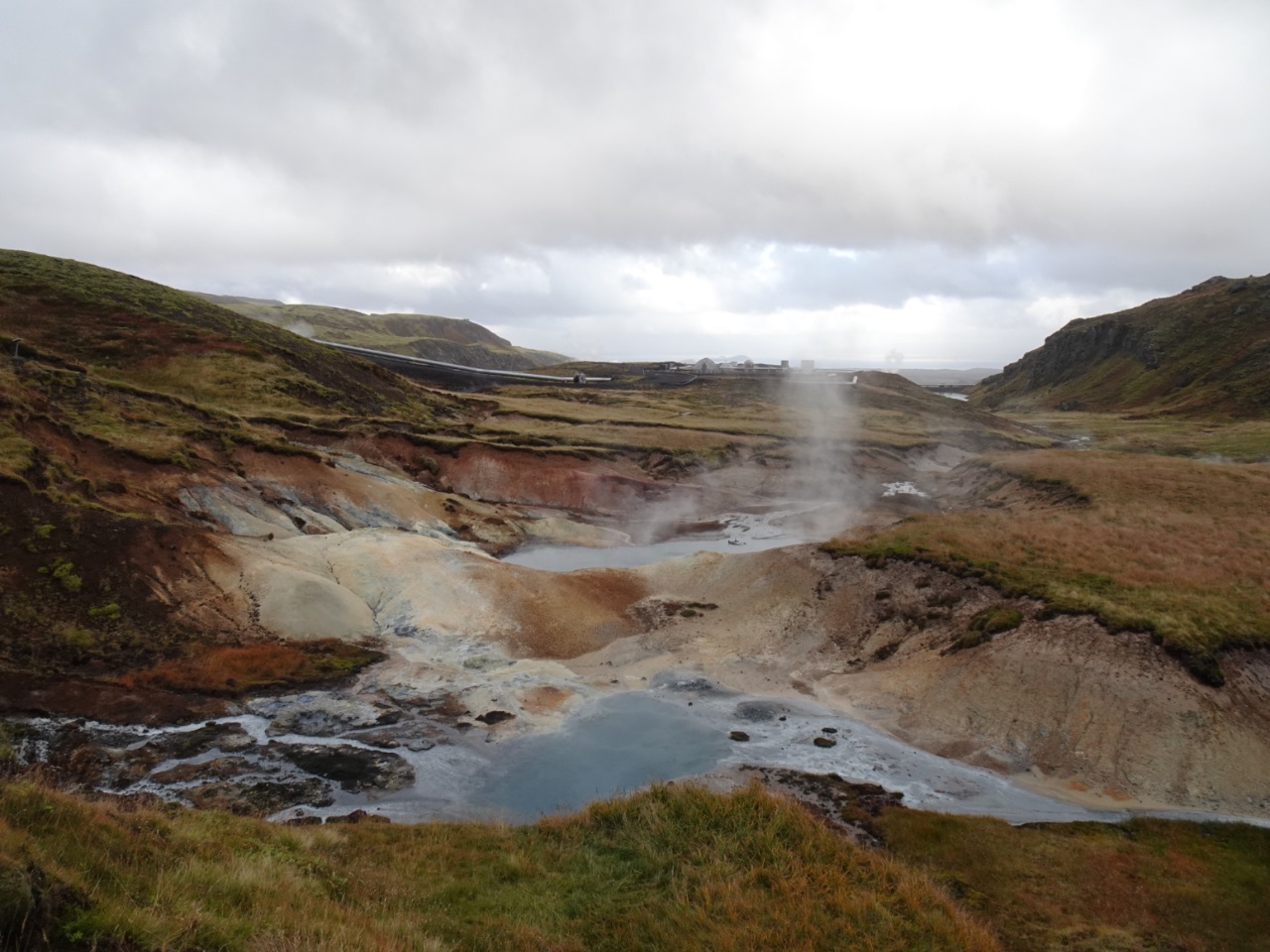 Vlak na de bergpas bij Hveragerði, maar echt vlak naast de ringweg, konden we al parkeren bij onze eerste stopplaats. De plek wordt Hveradalir genoemd, maar er zijn wel meer 'dalen met warme bronnen' met deze naam. Dit specifiek geothermisch veld ontstond nadat in de jaren '80 in het Hengillvulkaansysteem geboord werd om te onderzoeken of de locatie gebruikt kon worden vanwege zijn Aardwarmte.