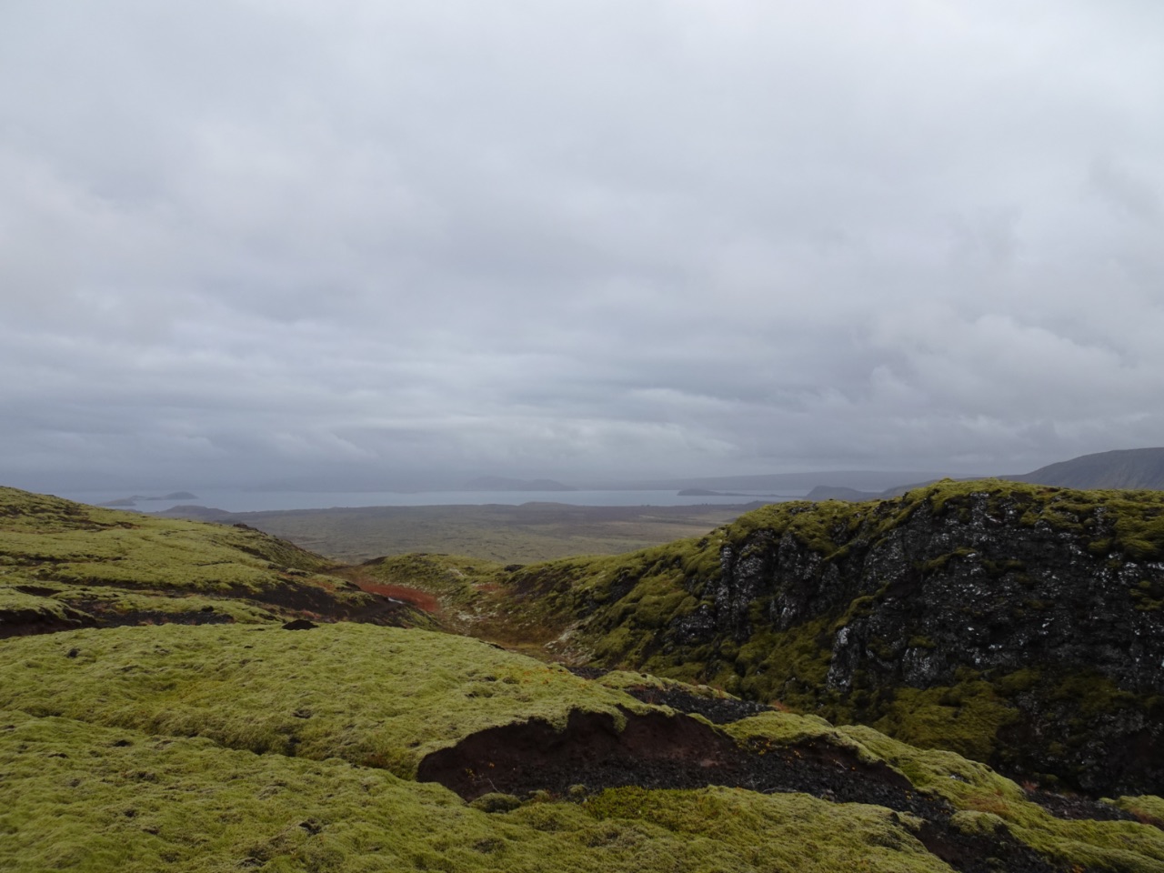 De route was 9 km lang en bracht ons op de meest bijzondere en mooie plekjes rond Nesjavellir! : We startten met een kronkelige afdaling doorheen felgroen bemoste lavavelden met zicht op het meer Þingvallavatn. Dan kwam een saai stukje wandelen langs de verharde weg naar ION Adventure Hotel Nesjavellir... maar daarna was het echt een erg mooie wandeling. We wandelden nog langs een lange lavascheur, langs de fabriek met al z'n buizen en stoom en dan volgden verschillende heuvels waarover het pad kronkelde. Het kronkelde omdat het langs verschillende geothermische velden liep, langs kleine warme en koude riviertjes, langs een waterval en zelfs kussenlava... en dat is best bijzonder want kussenlava ontstaat onder water. Oóit, toen die heuvels van kussenlava ontstonden, lag IJsland dus onder water... en dan volgden wéér enkele kleurige, modderige geothermische velden... en dan zaten we weer op een lavaveld en keken we over de energiecentrale, bij het uitkijkpunt waar we geparkeerd stonden...