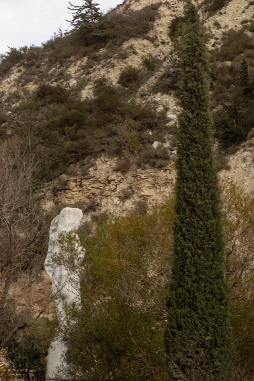 Nadat Johan, tussen de bomen door, nog snel een foto nam van het standbeeld van Aphrodite, stapten we dus weer onze Kia in. We hadden gehoopt dat de terugweg, een andere route dan hoe we naar de baden toe gereden waren, beter zou zijn... maar neen, hoor... en de wegwijzers met de boodschap dat ieder voertuig naar de baden kon rijden, bleven we voorbijrijden... Ine was, tegen de tijd dat we weer op asfalt terecht kwamen, stikkapot van het geconcentreerd zigzaggen en ervoor zorgen dat ze de Kia niet kapot zou rijden!