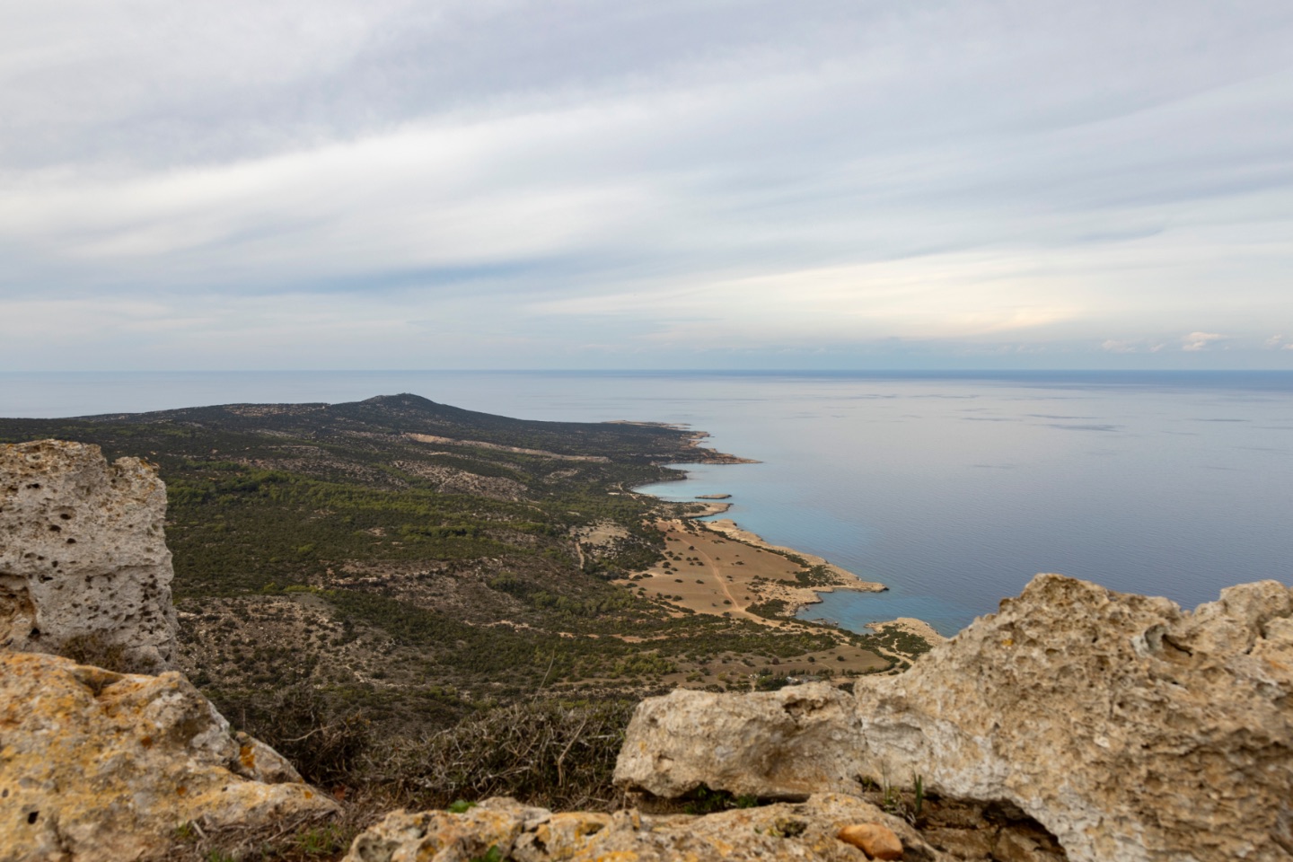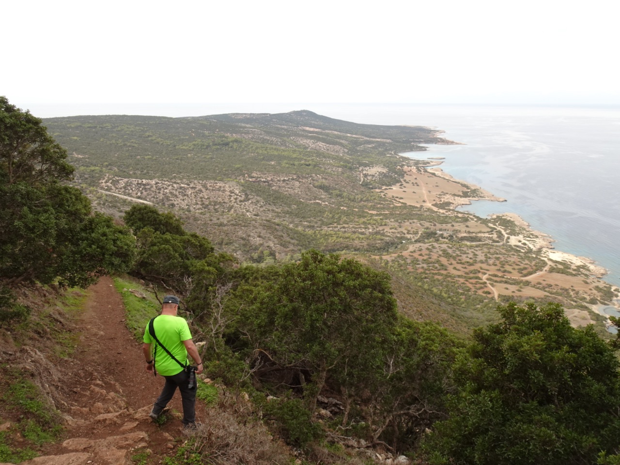 Al snel nadat we weer samen verder wandelden, en de afdaling ingezet werd, kreeg ook Ine hetzelfde zicht op de omgeving dat Johan bovenop de berg had gehad. We kregen tijdens de afdaling mooie, panoramische uitzichten op de Arnaoutis-kaap en over de Chrysochou Baai.
