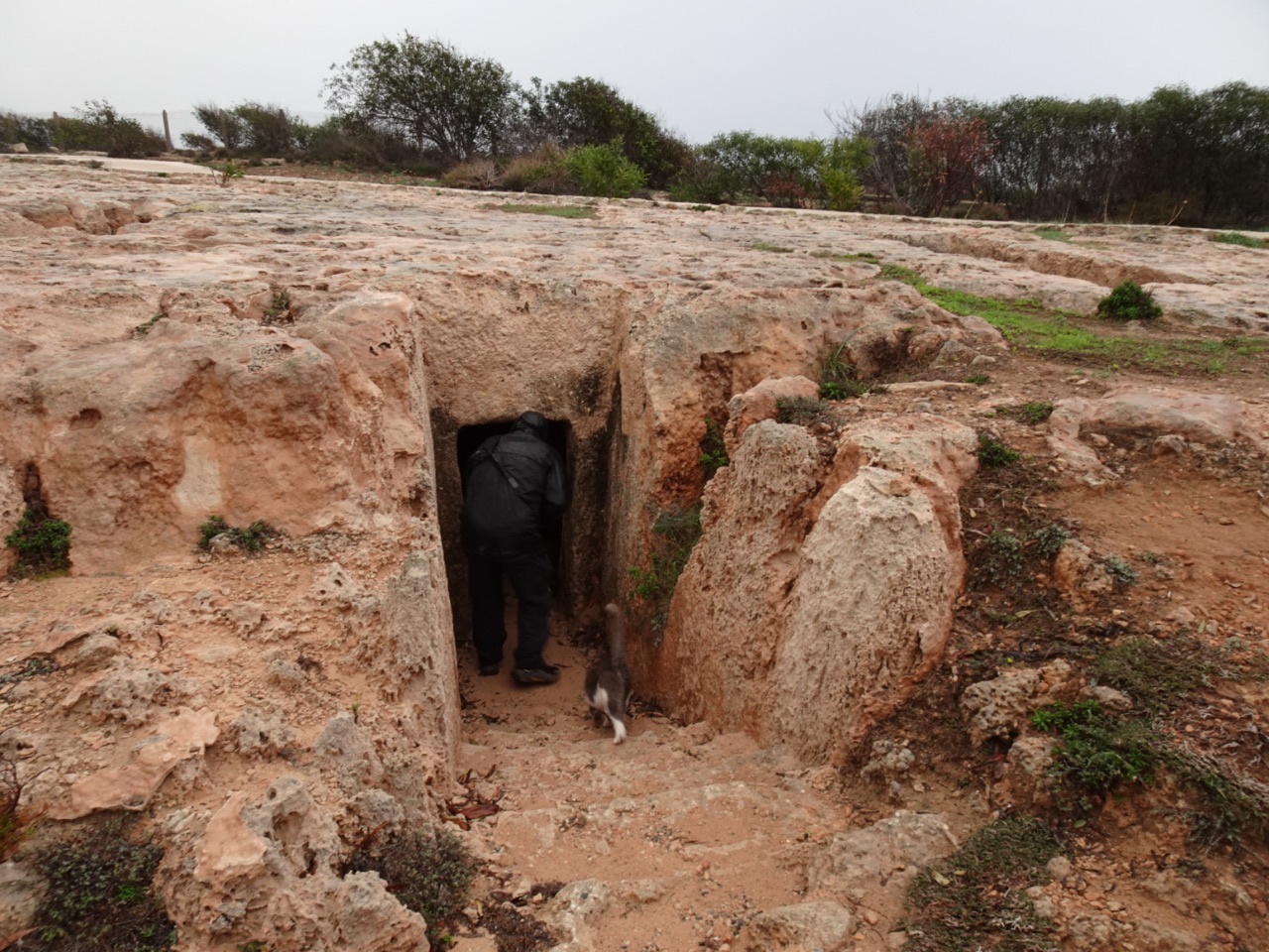 Alvorens terug naar ons appartement te rijden, stopten we nog bij het Makronissos-strand. Waarschijnlijk ziet dit strand er als het zonnig is erg mooi uit. Nu was het zwaar bewolkt, regende het en was het afgekoeld van de eerdere 23 naar 16°... geen strandweer, dus. Maar we waren er ook niet gestopt om naar het strand te gaan kijken. Een beetje weggestopt in een bosje bij de kliffen bezochten wij de