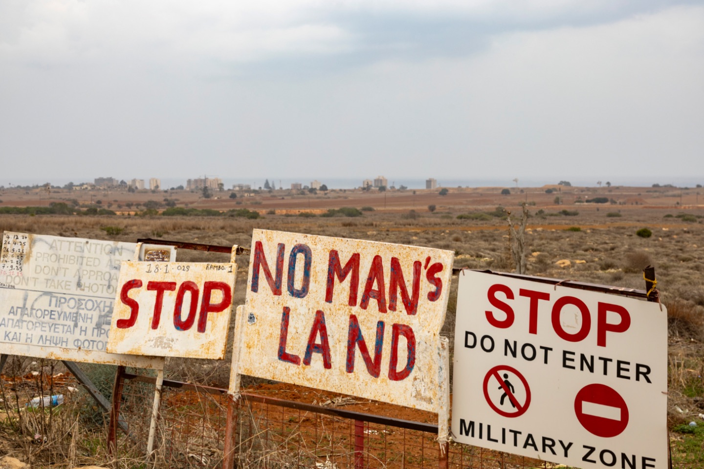 Famagusta. Ertussen ligt een hele zone "niks". Er groeit enkel onkruid en er liggen wat wegen. De hotels die je, in Famagusta, ziet liggen, zijn, logisch, niet in gebruik. Deze zagen we in juni '24 ook vanuit Famagusta liggen.
