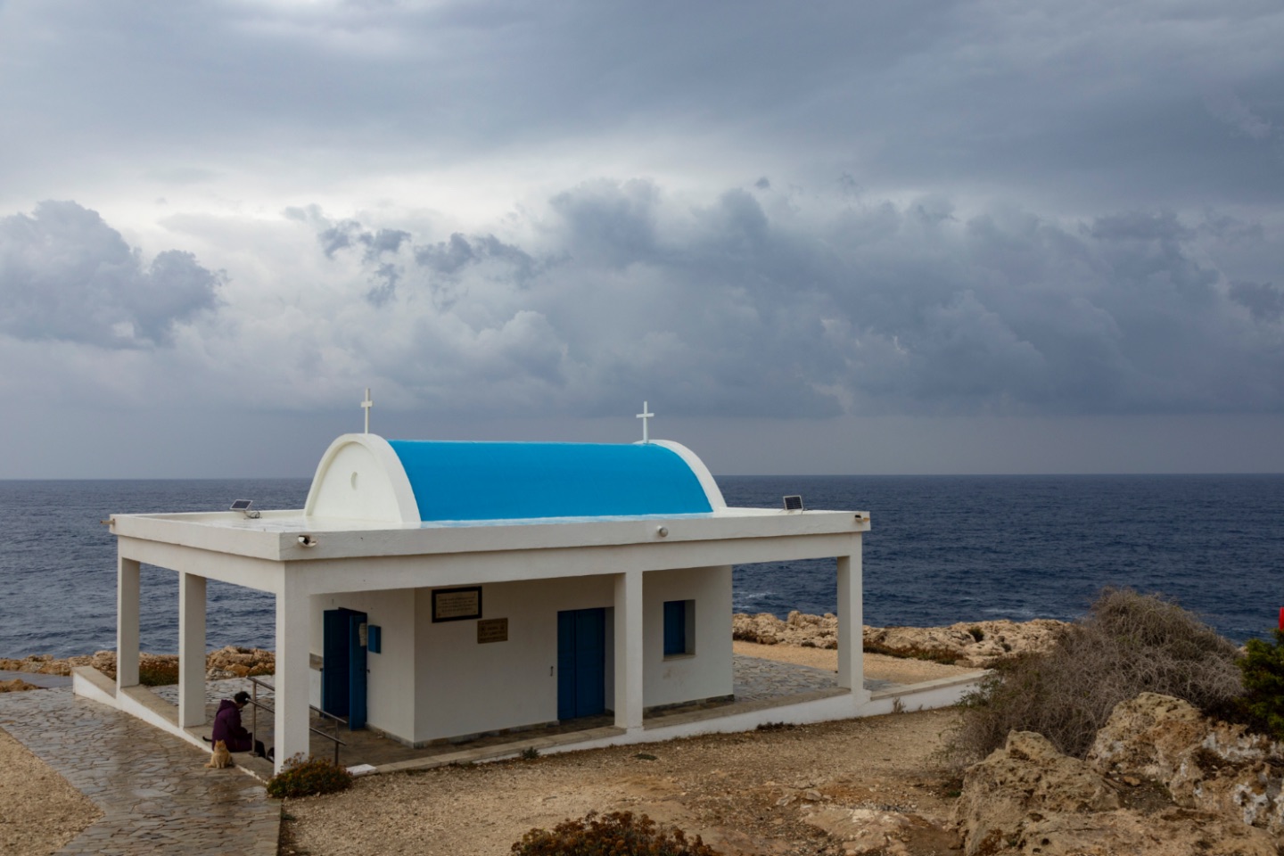 Bij het bezoekerscentrum aan de Konnos Baai, waar de kliffen erg mooi zijn, splitsten we op: Johan ging wandelen en Ine reed met de auto naar dezelfde bestemming, het wit-blauwe kerkje Agioi Anargyroi. Dit kerkje/kapel werd in de jaren '50 gebouwd. Onder de klif waarop het kerkje staat, ligt een grot. Die was op het moment dat we er waren, niet goed te zien omdat de zee, anders dan in de zomer, best flink wat golven op de kliffen sloeg. Terwijl Johan nog aan het wandelen was, hield Ine zich er wat bezig met de plaatselijke katten.