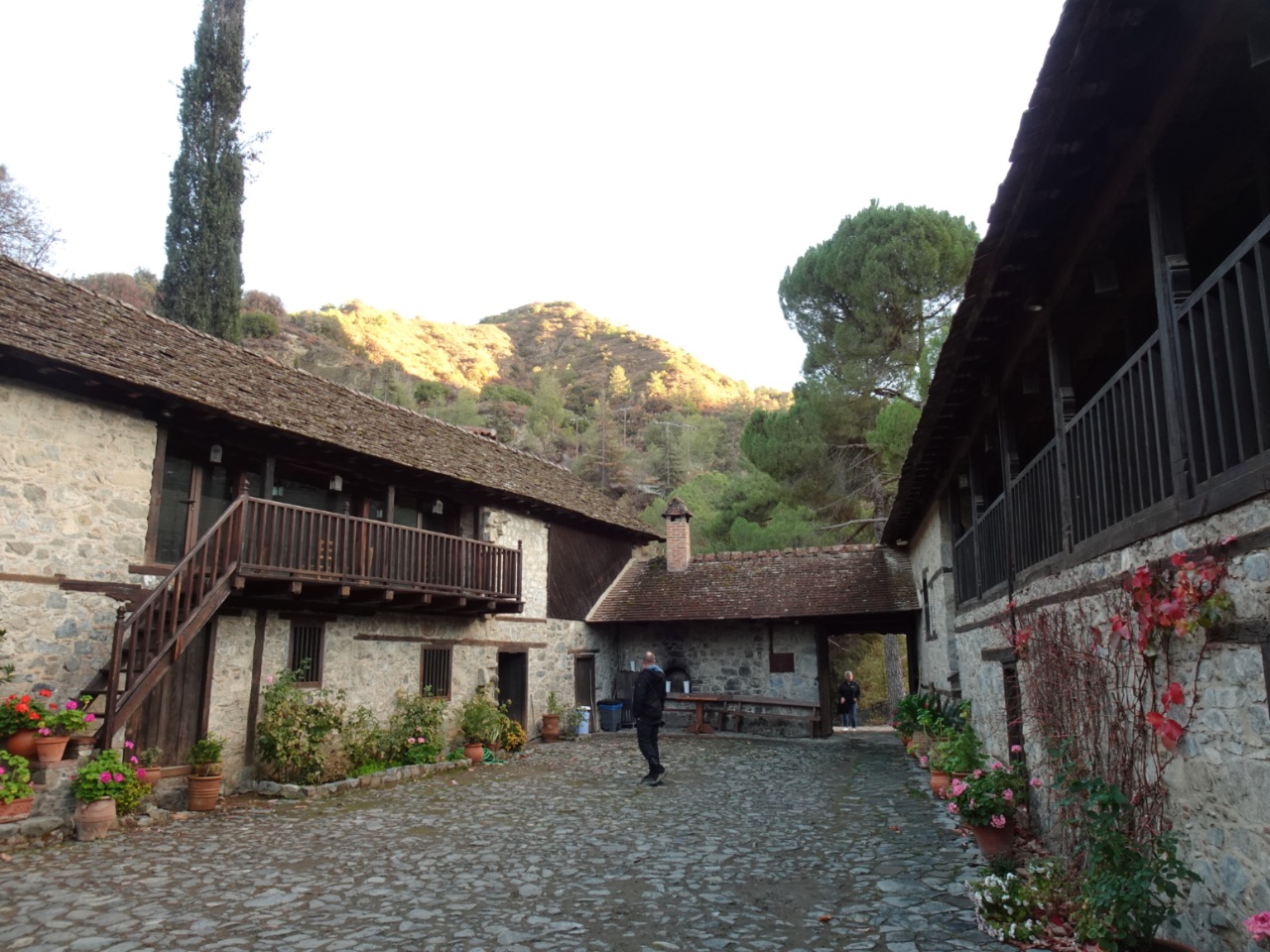 Beneden in het dal, in de vochtige mist, stopten we bij de abdij Stavros tis Psokas. Deze 19e eeuwse gebouwen zijn niet meer in gebruik als abdij. De hele locatie is omgevormd tot toeristische dienst, picnicplek en camping. Ook is de brandweer er gestationeerd om bij brand(-gevaar) op te kunnen treden vanuit het bos zelf.