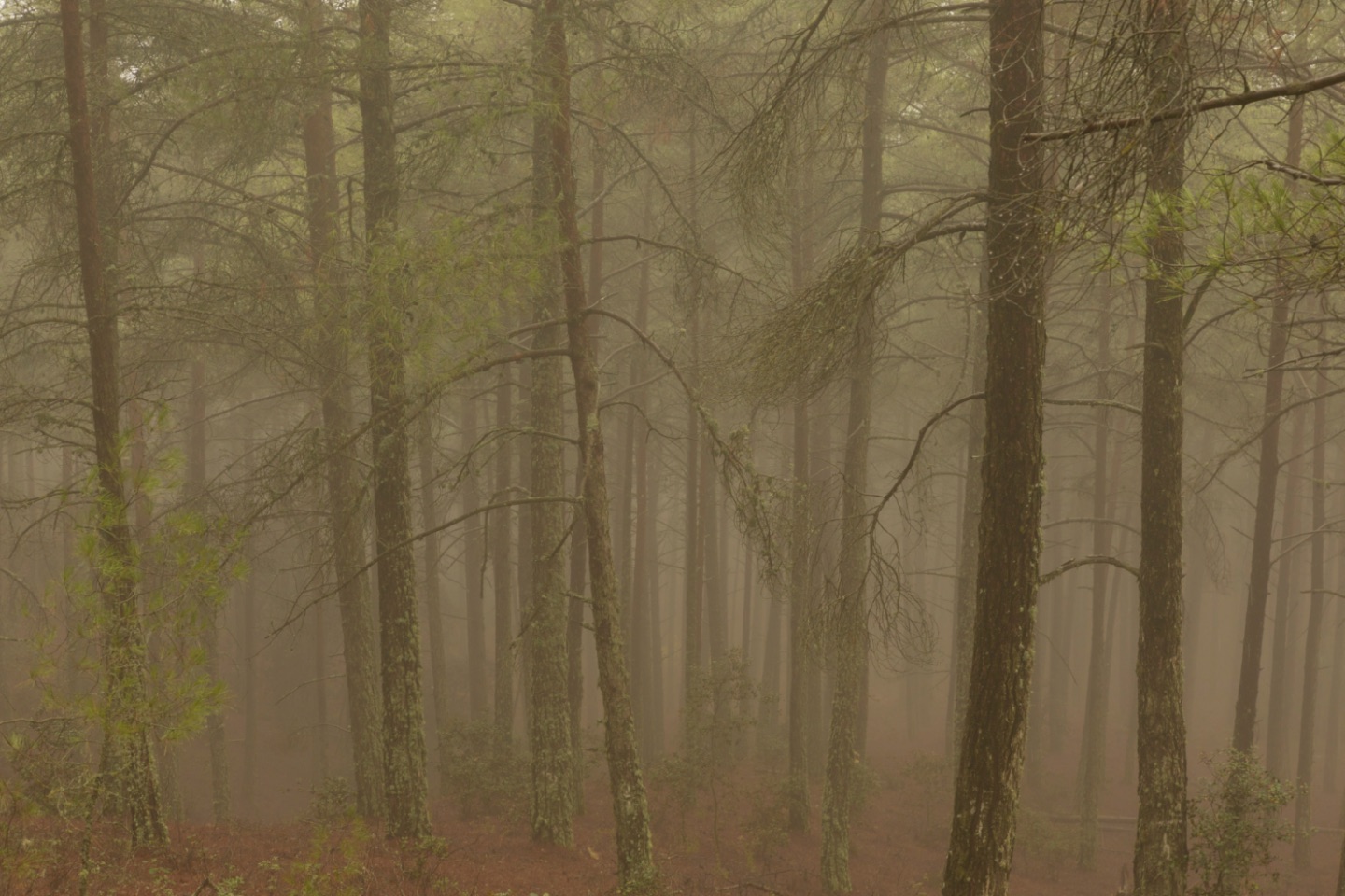 Onze wandeling haalden we uit onze Rother wandelgids en wordt er "Rond de Moutti tou Stavrou" in genoemd... en ja, we gaan ook bij slecht weer wandelen... De korte wandeling van 3 km liep op de flanken van een heuvel en door het bos dat er op ligt. In deze regio staan duizenden Cypriotische ceders. Deze endemische soort is nauw verwant aan de Libanese ceder. Deze bomen groeien vooral op hoogtes tussen 1000 en 1400 meter. De blauwgroene naaldachtige "bladeren" maken dat de regio steeds groen is... en op de grond zorgden die afgevallen naalden voor een mooie rode bodem. De mist, de groene boomtoppen en de rode bodem gaven een erg mooi, bijna mysterieus beeld aan het bos. Langs de flanken van de berg zorgden de wolken en mist ervoor dat er zo goed als geen uitzicht op de omgeving was, maar dat hoefde ook niet. De dag voordien hadden we al veel panorama's over het Troödosgebergte gezien. Het was een korte, maar erg mooie wandeling. En zoals verwacht, kregen we geen moeflons te zien of te ruiken.