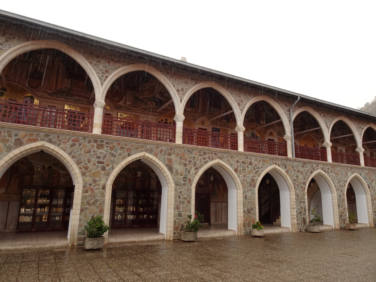 Terwijl we onze weg terug reden, waren al veel van de gevallen stenen 'geveegd' met de bulldozer, maar het bleef toch goed opletten, want er waren echt serieuze stenen naar beneden gevallen. De abdij van Kykkos waren we 's ochtends voorbij gereden, maar bezochten we wel op onze terugweg. Deze abdij is de grootste en het rijkste van alle kloosters op Cyprus. Het is, net als de andere die we bezochten, een Cypriotisch Orthodox klooster. Het werd gesticht in de elfde eeuw en is gewijd aan de Maagd Maria. Hun pronkstuk is een icoon van Maria met Jezus, geschilderd door apostel Lucas, die de macht heeft om regen te brengen... en dat was die dag zeker gelukt!