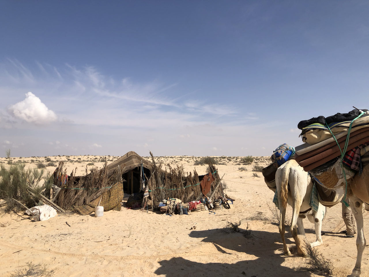 We kwamen ook enkele "vrije" dromedarissen tegen. In het Saharamuseum hadden we, twee dagen voordien, gehoord dat dromedarissen niet steeds 'thuis' gehouden werden, maar in de woestijn 'los' worden gelaten. Doordat de dieren gebrandmerkt worden op hun achterbeen, weet men wie de eigenaar is en doordat de dieren na enkele dagen sowieso naar een waterpunt gaan, weet men ook waar ze rondhangen en wat hun gezondheidstoestand is... Rijken hebben meer dan een 500-tal dromedarissen, zei men ons in het museum... 's middags, onderweg terug naar Djerba, kwamen we ook verschillende groepjes en groepen "vrije" dromedarissen tegen langs en op de weg.Na zo'n 6,5 km wandelen op iets minder dan twee uur tijd zagen we een echte bedoeïenentent liggen. Dit bleek de eindbestemming van onze wandeltocht te zijn. Er werd verteld dat de tent eigendom was van de familie van onze dromedarisdrijver, net als iedereen die in die omgeving woont (van afkomst) Bedoeïene. De tent werd nog door de familie gebruikt voor uitjes en weekendjes-weg. We namen er plaats in, op een kussen op de grond.Het tentzeil was oud en versleten en was op verschillende plaatsen hersteld. Ook van in het Saharamuseum wisten we dat dit tentzeil van banden geweven geitenhaar gemaakt is. Het aantal banden dat een tent groot is, was in het verleden hetzelfde aantal als het aantal gezinsleden. De tenten werden dus groter als het gezin groter werd. Dit soort tentzeilen maken, was specialisten werd en nam veel tijd in beslag. Het feit dat gesponnen geitenhaar gebruikt werd, maakte het waterdicht. Iedere band wordt, met een dikke horizontale tak, strak getrokken en met (nu metalen, vroeger houten) stokken in de woestijngrond vastgezet. Zo'n bedoeïenentent staat dus zeker stevig. Ze werd ook voor enkele maanden / weken opgezet en pas daarna weer afgebroken, om vervolgens weer elders opgezet te worden.