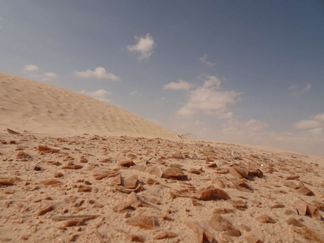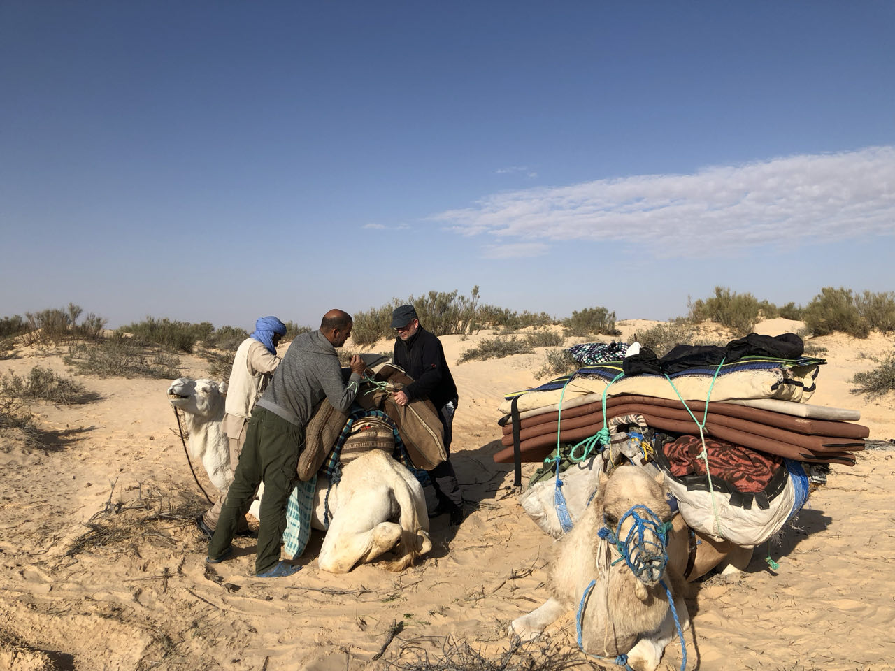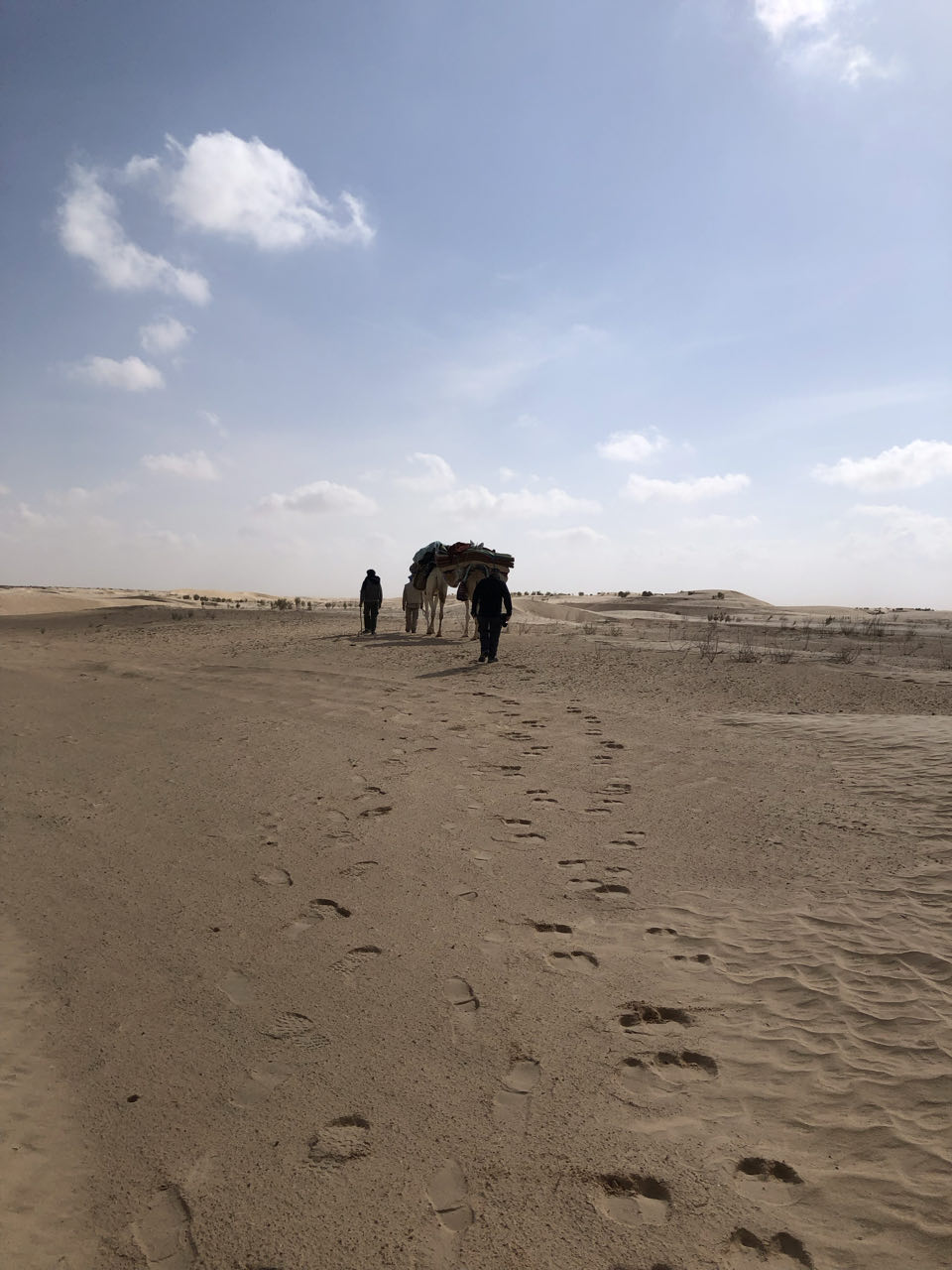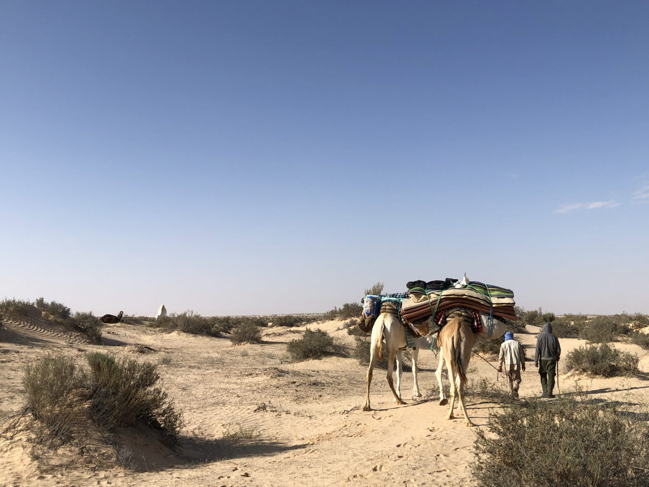 Rond 8:45 uur waren we, voor de laatste keer, weer onderweg met 'onze' dromedarissen en begeleiders. Doordat er, anders dan de twee dagen voordien, geen wind was, was het al snel erg warm! en dan zal het waarschijnljk niet eens veel boven 20° geweest zijn... onze begeleiders, die niet zoals ons konden drinken vanwege ramadan, moeten afgezien hebben... al zullen zij het niet bepaald warm gevonden hebben...Ditmaal zagen we onderweg meer dan zand, woestijnroos, plantjes ed. We zagen, op een honderdtal meters, enkele (plastieken) "tentenkampen" en kuddes van herders die enkele maanden in de woestijn wonen en dan weer een tijdje terug naar vrouw en kinderen gaan in een oase als bv. de stad Douz, kregen we te horen. We kwamen ook één van hen tegen die, zo vermoeden we, aan zijn tas te zien, ging controleren wat er in de gelegde strikken terecht was gekomen... we zagen eerder al zulke strikken ook op verschillende plaatsen, achteloos, liggen... net als lege, uitgebrande, blikken. Etensresten worden voor de dieren achtergelaten en afval wordt opgebrand, maar blik laten ze liggen... terwijl dat helemaal niet vergaat... :-(