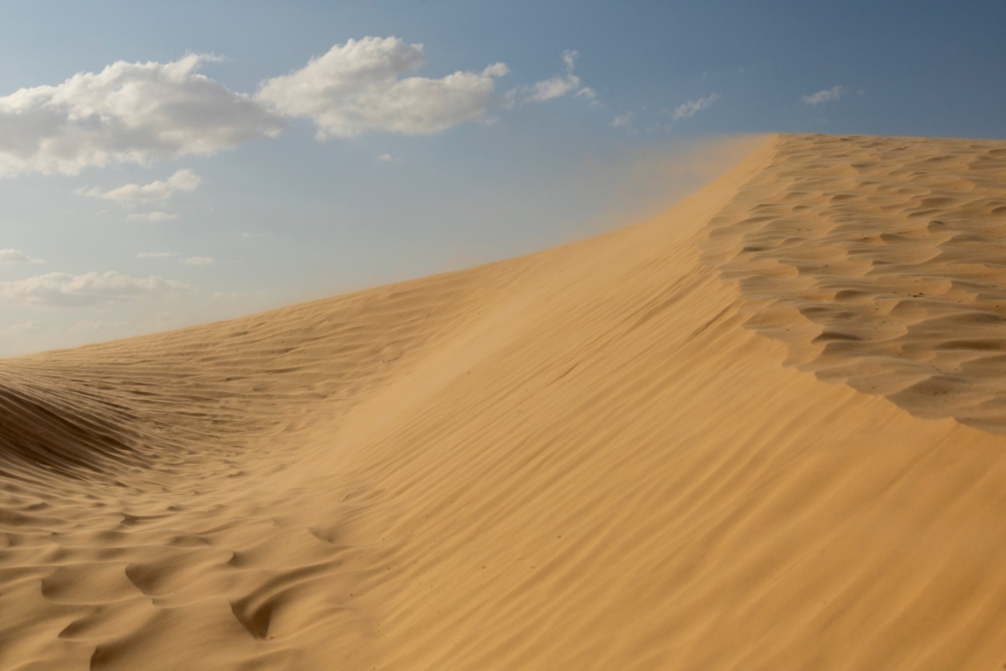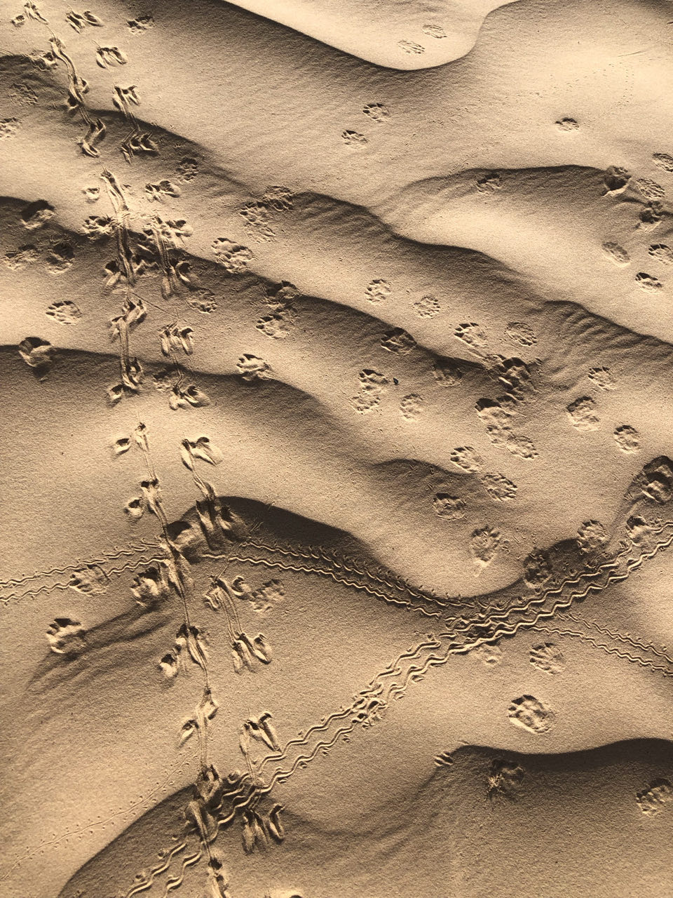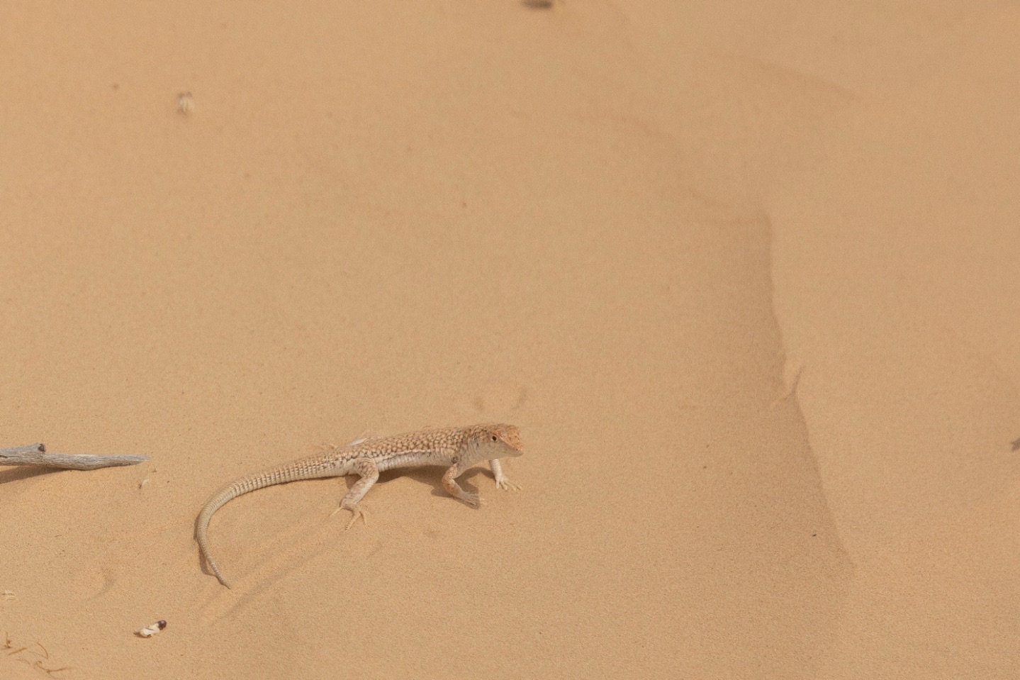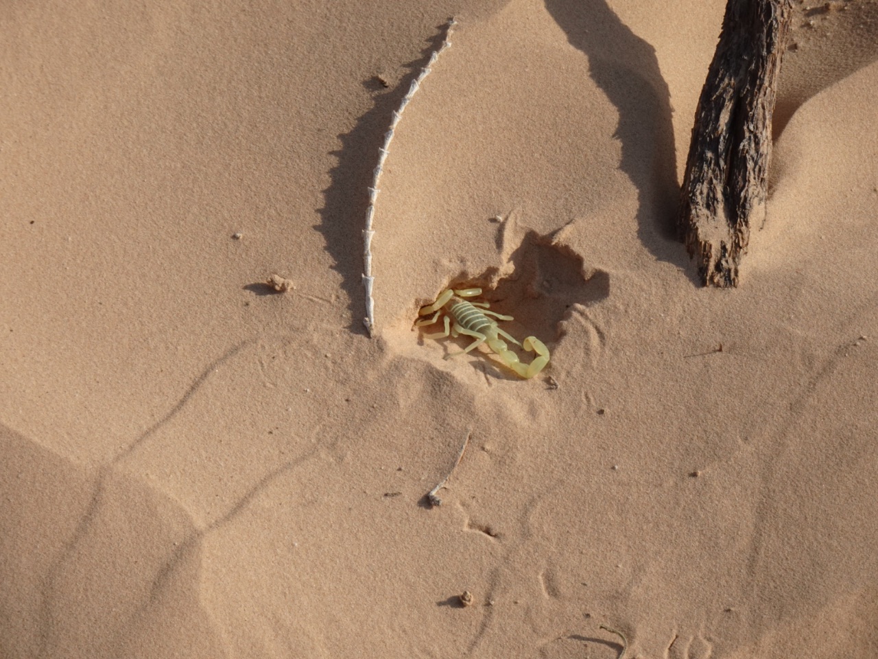 Rond 8:45 uur waren we, voor de laatste keer, weer onderweg met 'onze' dromedarissen en begeleiders. Doordat er, anders dan de twee dagen voordien, geen wind was, was het al snel erg warm! en dan zal het waarschijnljk niet eens veel boven 20° geweest zijn... onze begeleiders, die niet zoals ons konden drinken vanwege ramadan, moeten afgezien hebben... al zullen zij het niet bepaald warm gevonden hebben...Ditmaal zagen we onderweg meer dan zand, woestijnroos, plantjes ed. We zagen, op een honderdtal meters, enkele (plastieken) "tentenkampen" en kuddes van herders die enkele maanden in de woestijn wonen en dan weer een tijdje terug naar vrouw en kinderen gaan in een oase als bv. de stad Douz, kregen we te horen. We kwamen ook één van hen tegen die, zo vermoeden we, aan zijn tas te zien, ging controleren wat er in de gelegde strikken terecht was gekomen... we zagen eerder al zulke strikken ook op verschillende plaatsen, achteloos, liggen... net als lege, uitgebrande, blikken. Etensresten worden voor de dieren achtergelaten en afval wordt opgebrand, maar blik laten ze liggen... terwijl dat helemaal niet vergaat... :-(