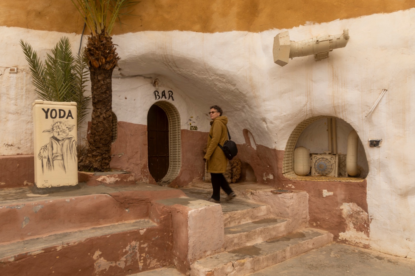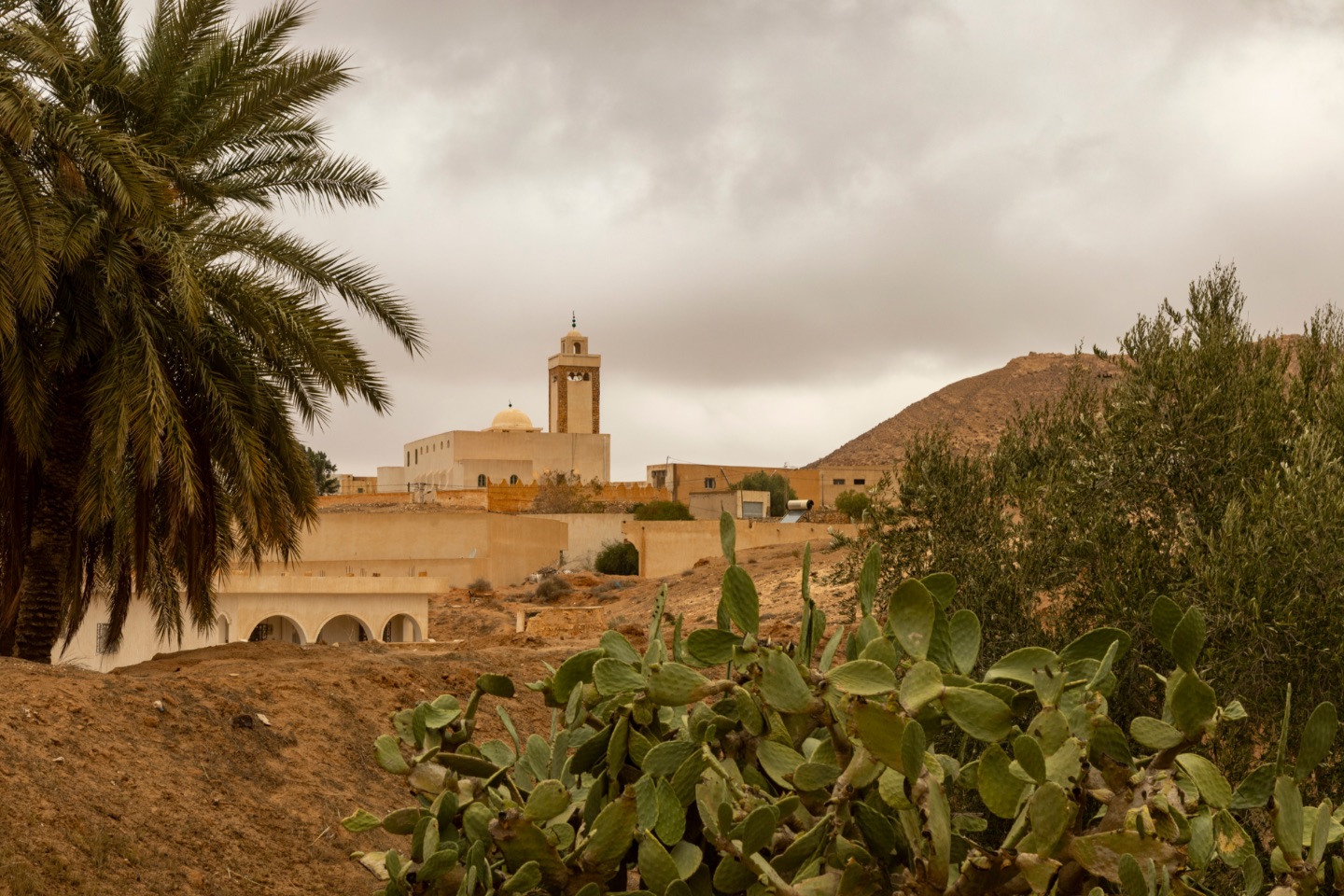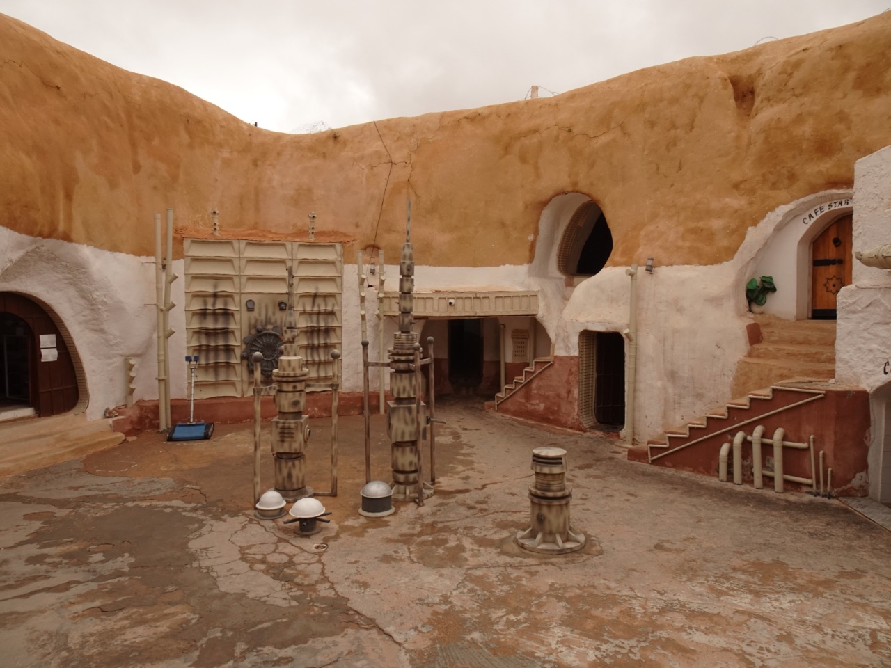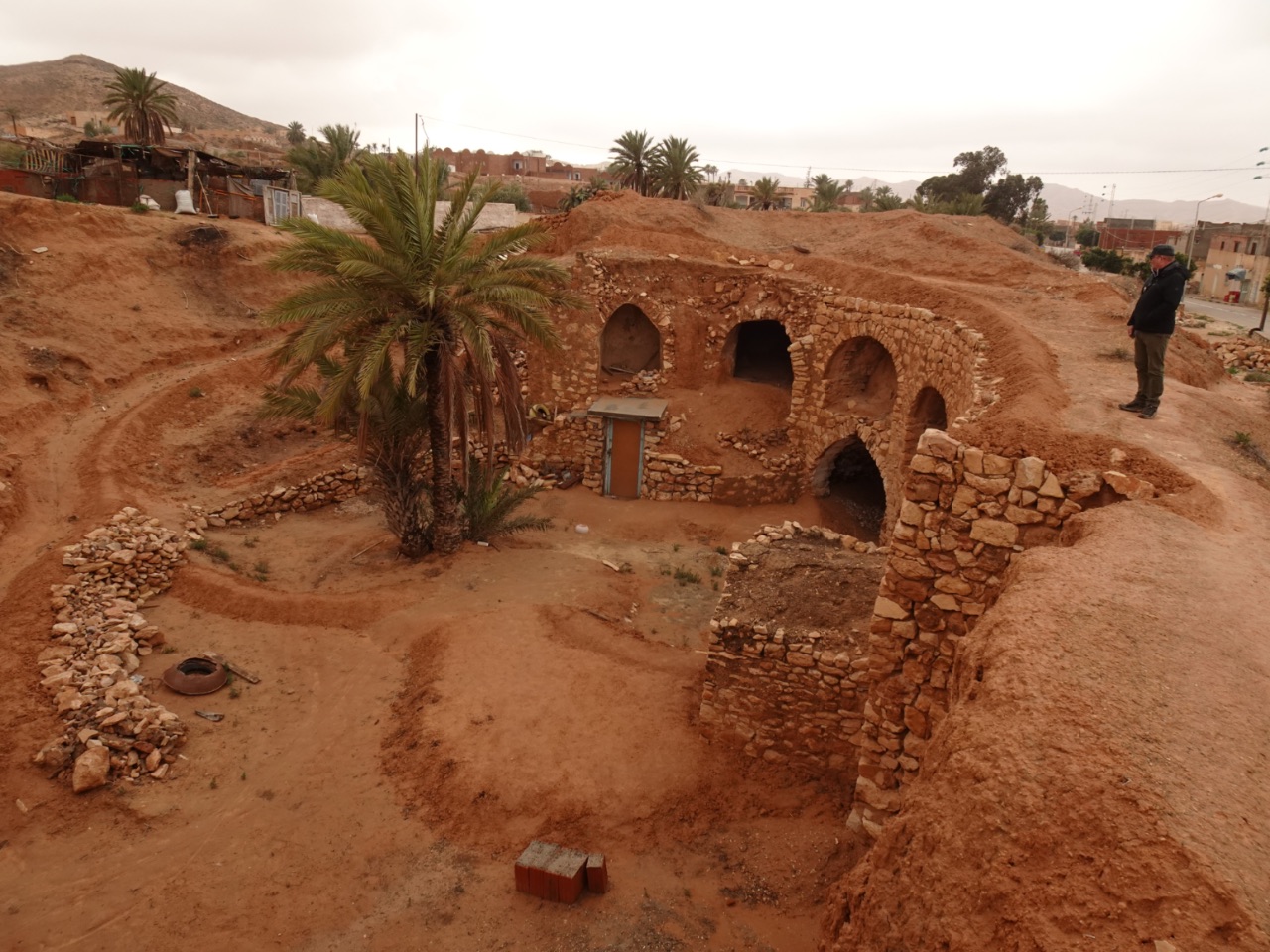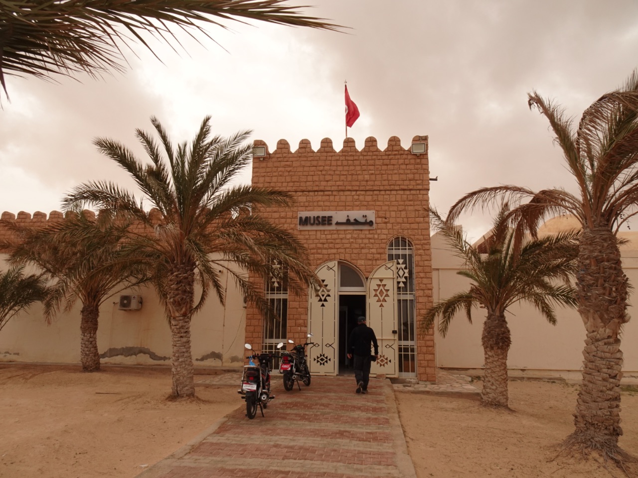 We reden de meest zuidelijke provincie van Tunesië uit en reden naar het noordwesten. Gaandeweg veranderde het landschap : het werd steeds vlakker en zanderiger... en zo kwamen we aan in Douz. Deze stad in een grote oase wordt "de toegangspoort tot de Sahara" genoemd... en in feite is dat ook echt zo want in de wijde omgeving zijn er geen grote steden meer tot aan de grens met Libië en Algerije.We reden volledig door het centrum van Douz. Net als in alle plaatsen waar we doorreden, lag het er een beetje troosteloos bij aangezien alle horeca-zaken gesloten zijn vanwege Ramadan. We stopten, vlka buiten het centrum, aan het Sahara Museum. In het museum werden we rondgeleid door een gids. Hij gaf ons uitleg over de cultuur van de Tunesische Bedoeïenen en het leven in de Tunesische woestijn. We kregen uitleg over de verschillende Bedoeïenenstammen, de dromedarissen, geneeskrachtige kruiden uit de woestijn, traditionele klederdracht, de bedeïenetenten enz. Interessant!