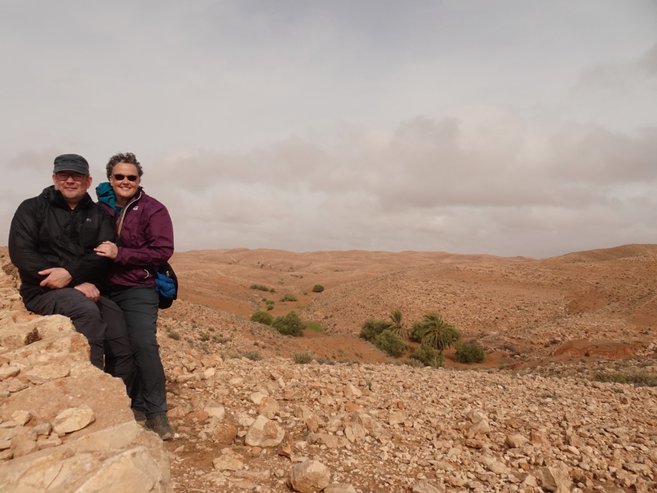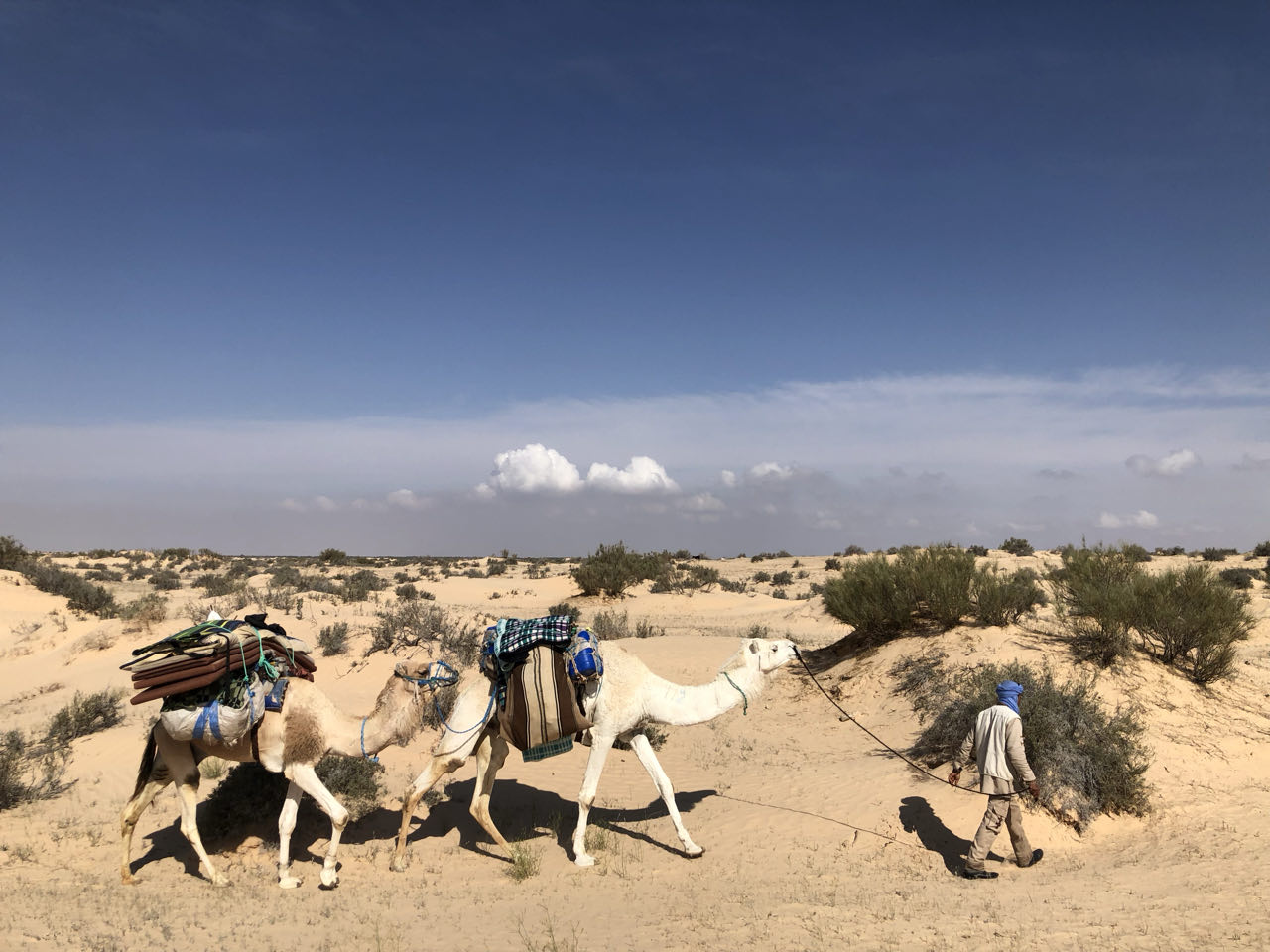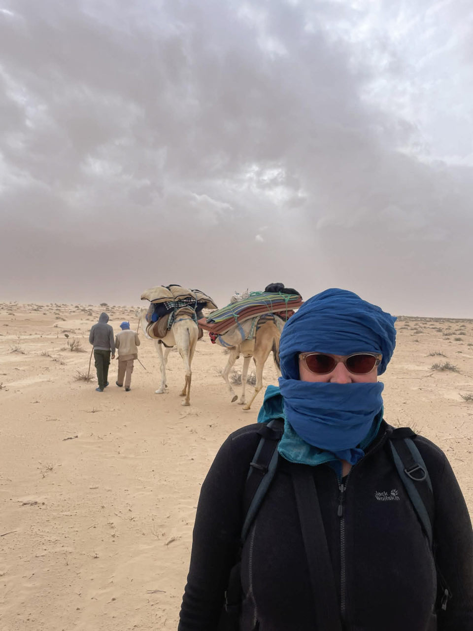 Het was een flink tempo dat onze dromedarissen en begeleiders aanhielden! We konden maar net volgen in de soms 'diepe' zandduinen. Bij een eerste rustpauze, Ine zal een rood hoofd gehad hebben, vroegen de begeleiders of ze geen sjaal had. En ja, die had Ine, voor het geval ze moskeeën binnen zou gaan. Omdat Ine totaal niet wist hoe ze de sjaal over haar hoofd en mond moest doen, kreeg ze hulp. De sjaal was veel te kort, maar de heren slaagden er toch in om een Bedoeïene van Ine te maken. Dat was best warm, maar de zand werd zo wel minder in haar mond geblazen... en uit beleefdheid hield Ine de doek nog op haar hoofd. Drinken deden we steeds stiekem zodat onze begeleiders het niet zouden zien... zij mochten immers niet drinken... en met die waaiende zand en het knarsentanden daardoor moet dat heel vervelend geweest zijn!