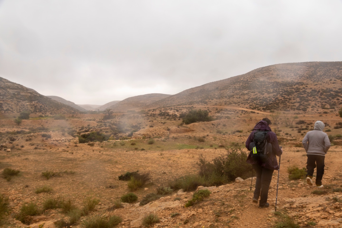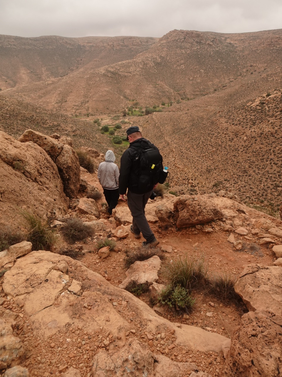 De weg die we wandelden, kronkelde zich door de heuvels van het Dahargebergte. Dit maakte het nog interessant en mooi. Achter iedere heuveltop dook steeds weer een nieuw panorama op aan volgende heuvels en dalen. De begroeiing bleef identiek als dat we de dagen voordien al zagen.Op een gegeven moment zagen we de jeep warin we reisden staan op een van de verdere heuvels... maar die reed dan weer verder. En hetzelfde gebeurde toen we het dorp in zicht kregen... we werden dus toch nog in het oog gehouden ;-)