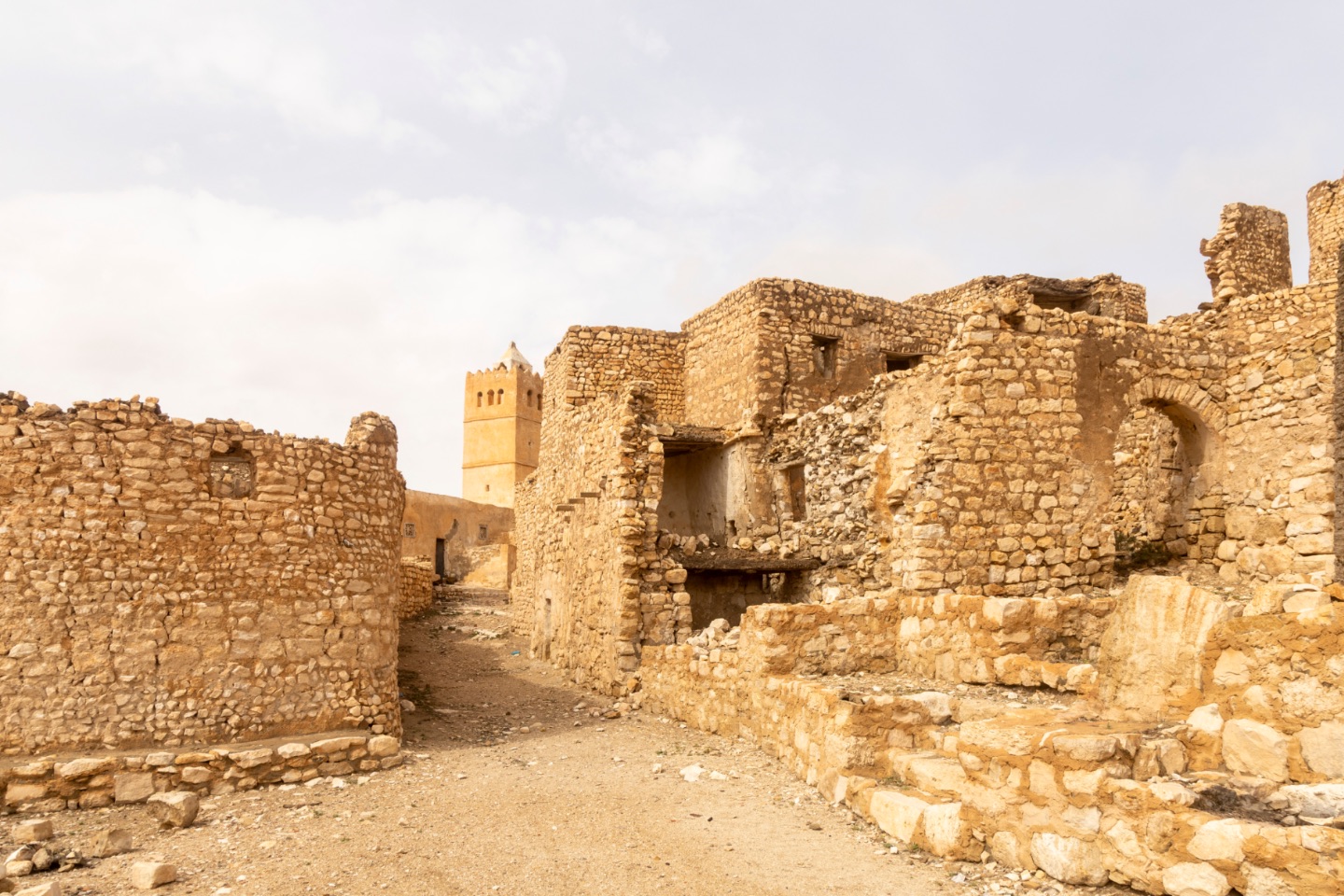 Na 7 km en z'n twee uur na vertrek kwamen we bij onze jeep aan, die ondertussen weer wat verder het dorp ingereden was. We stapten nog niet in want de chauffeur zou ons op het einde van het dorp treffen, zei hij. Pas nadat hij verteld had dat er nog maar één familie met hun kudde schapen en geiten in het vervallen dorp woonde, reed hij verder. We zagen in de vervallen huizen ook verschillende geiten, zo van die grote met lange oren en lange haren, staan en in andere huizen, waar wel nog een dak op zat, zagen we de hooivoorraad liggen. Ook zagen we in een ander deel van het grote dorp een herder met een kudde geiten en schapen aan de waterput.We kwamen al snel weer de jeep tegen. De chauffeur was stenen van de weg aan het gooien en aan het verleggen... Er was een woning ingestort en die was op de weg door het dorp terecht gekomen. Johan ging helpen. Na een tijdje vroeg Johan of een andere weg nemen geen mogelijkheid was. De chauffeur legde uit dat dit kon, maar dat over die wegen rijden veel langer zou duren omdat die slecht waren. Als hij over het ingestorte huis geraakte, zouden we een veel betere en snellere route naar Douz hebben... wat nog, via die route nog 100 km rijden was...