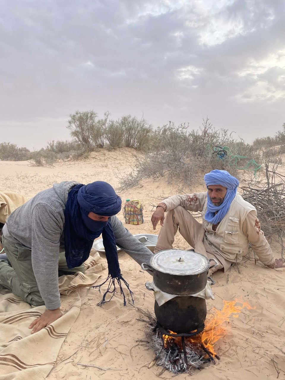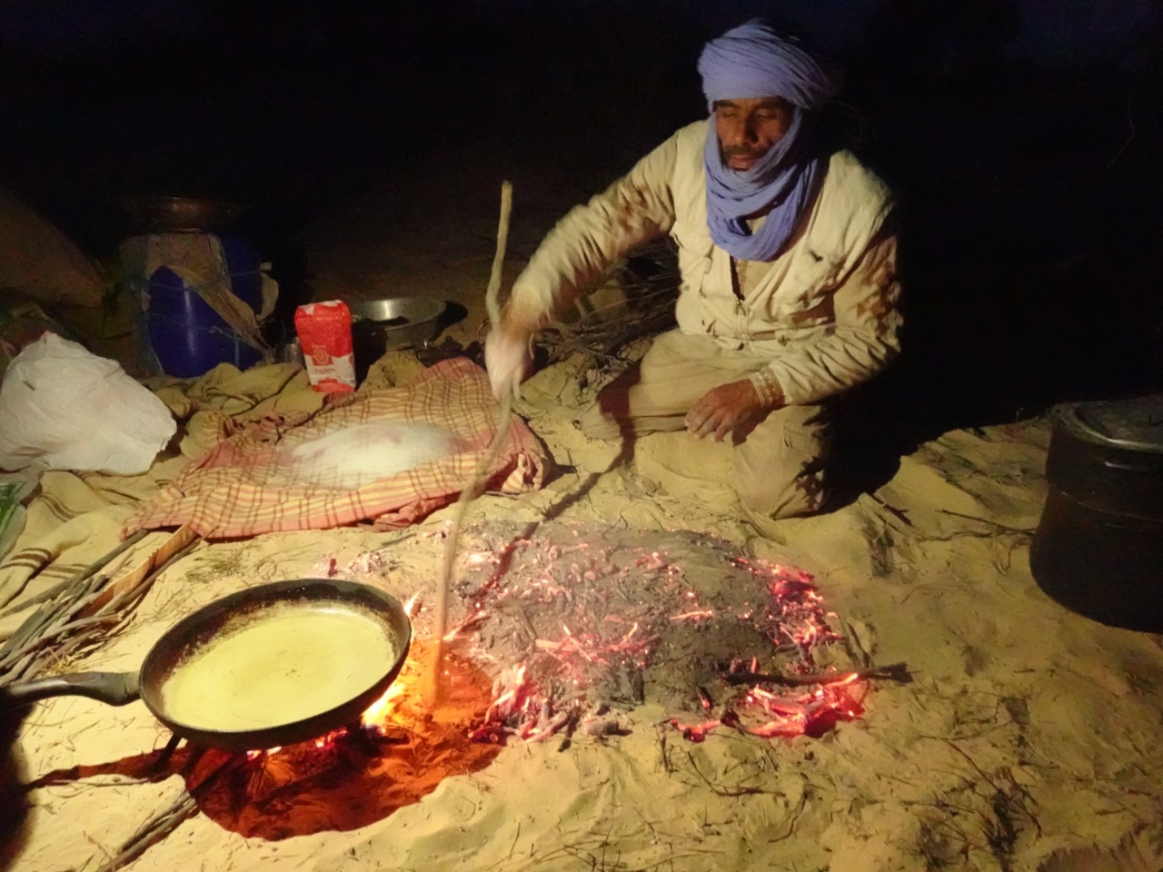 Toen Ine zich bij de anderen voegde, stond al een soepje te pruttelen op een vuurtje en gingen de groenten en het lamsvlees er in een stoompot bovenop. Terwijl Johan gevraagd werd het vuur gaande te houden, werd nog meer hout gesprokkeld en werden de dromedarissen teruggehaald. De touw rond hun voorpoten werd strakker aangespannen, ze gingen zitten en bleven zitten... na eventjes ;-)Om 18:31 uur was de zon onder en was het iftar. Onze begeleiders waren zo gelukkig als kleine kinderen dat ze konden eten! Ze startten met (een oneven aantal) dadels en karnemelk met water. Ook wij deden mee. Daarna gingen ze verder met koken, wat vanwege de primitieve omstandigheden en het slechts éne vuurtje in episodes ging... alhoewel... terwijl de kok bezig was met het verder bereiden van het hoofdgerecht en nadien het voorgerecht, maakte de dromedarisbegeleider / kokhulpje het deeg voor het brood klaar. We hadden tijdens onze reis al gehoord over het "pain de sable", het zandbrood, maar zagen het nu echt: het deeg werd op een handdoek over een hoopje zand gelegd om het rond van vorm te maken maar door er ook een bolle/holle kant aan te maken. Er werden houtskooltjes van onder het kookvuur plat verspreid over het zand en daar werd het deeg opgelegd. Het deeg werd vervolgens ook bedekt met deze houtskooltjes. De warmte van het zand en de kooltjes maakte vervolgens dat het brood bakte. Door op het brood te tikken, hoorden ze of het al goed genoeg gebakken was om het brood om te draaien. Ook na het draaien gingen er weer warme houtskooltjes op het brood. Toen het brood overal "goed klonk" als er op getikt werd, werden de kooltjes en het zand er afgeklopt en was het brood klaar!